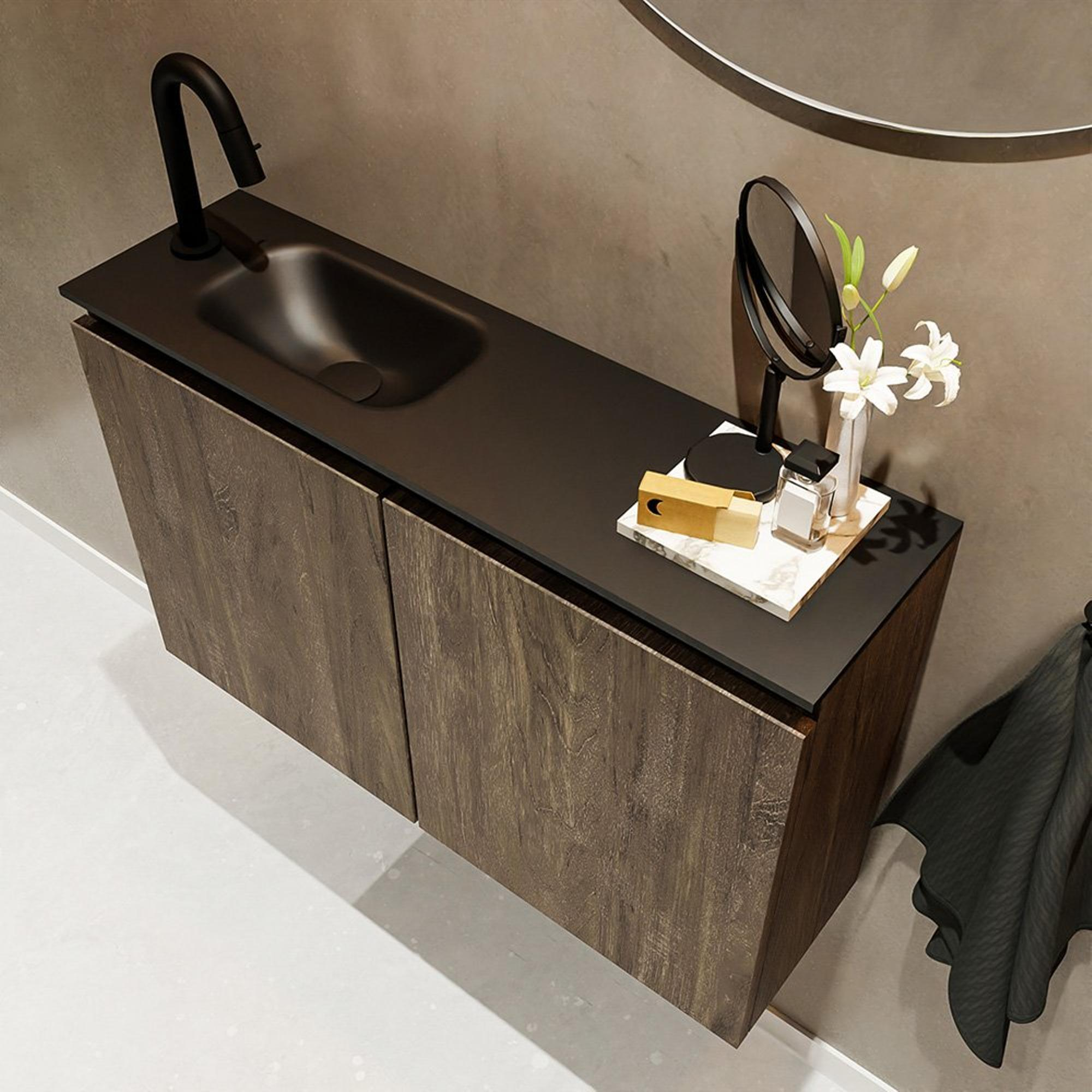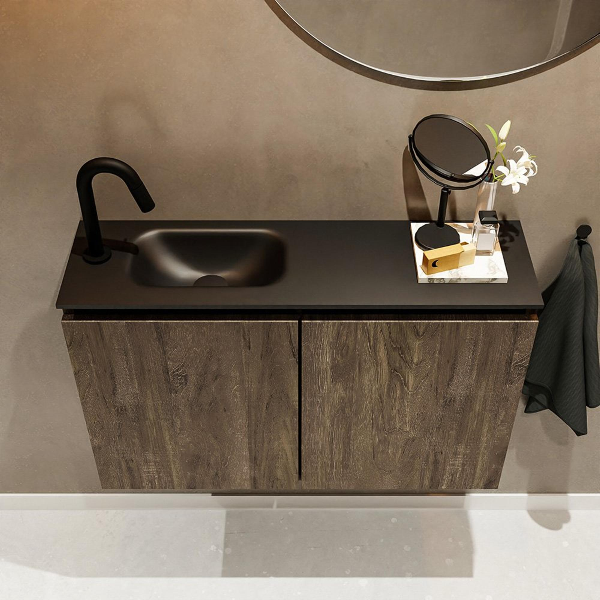 MONDIAZ TURE Kit lave-mains - 80x23x50cm - 1 trou de robinet - 2 portes - marron foncé mat - Lavabo à gauche - Acrylique Noir