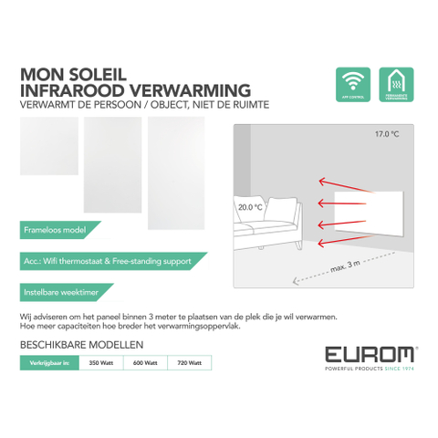 Le chauffage infrarouge Mon Soleil 601 Wifi offre une manière efficace et économique de chauffer. Le radiateur peut être étendu avec un thermostat supplémentaire et est parfait comme chauffage permanent.