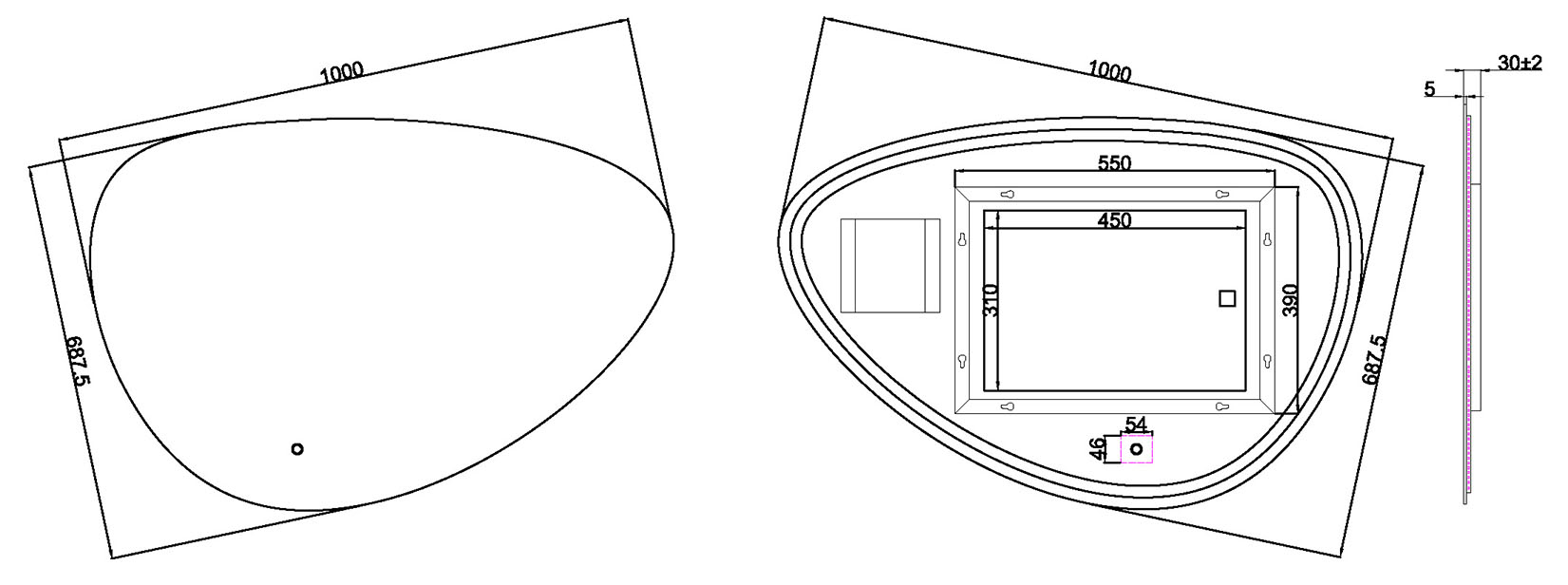 - Forme ovale asymétrique de 100 cm de large et environ 69 cm de haut pour une apparence élégante