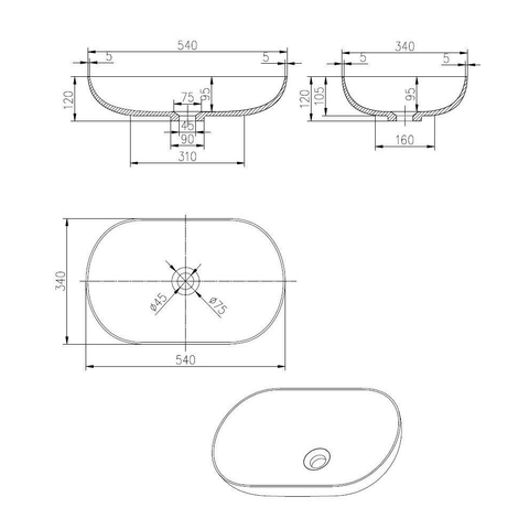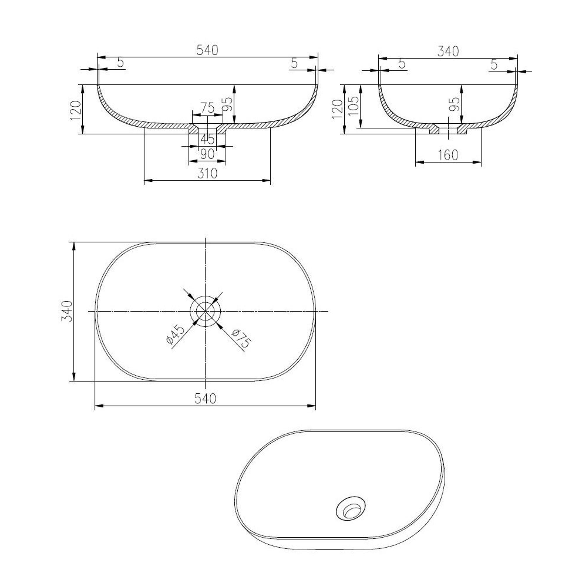 - Évacuation au centre avec orifice d’environ 45 mm pour bonde de lavabo standard
