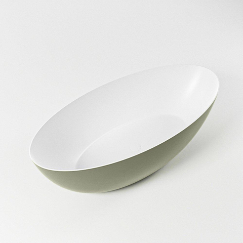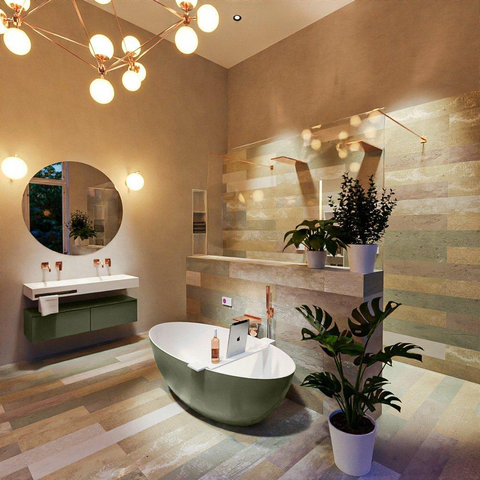 La combinaison d'un extérieur couleur army et d'une baignoire intérieure blanche talc offre un look raffiné et contemporain que l'on ne voit pas souvent. La forme ovale douce a une apparence chaleureuse et apaisante, sans arêtes vives ni détails chargés. Ainsi, l'ensemble reste léger, même si votre salle de bains n'est pas très grande, tout en faisant de la baignoire le point central naturel de l'espace. La finition mate s'accorde à merveille avec des carreaux modernes, des robinets noirs ou colorés et des meubles de salle de bains minimalistes. Que vous optiez pour des tons ton sur ton ou au contraire pour un contraste avec des murs clairs, cette baignoire aide à créer un aménagement de salle de bains cohérent et luxueux qui restera élégant pendant de nombreuses années.