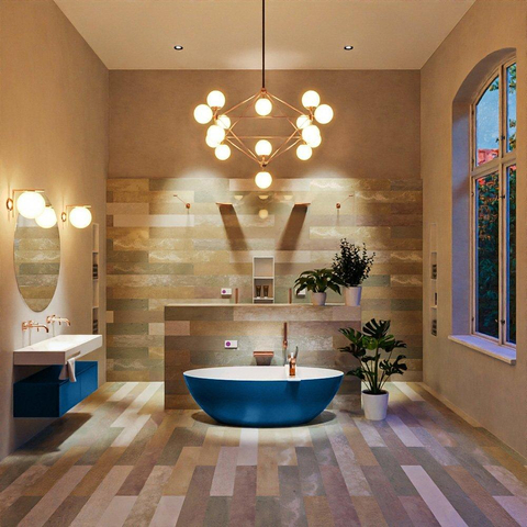 Déclaration design en bleu Jeans avec baignoire intérieure blanche élégante