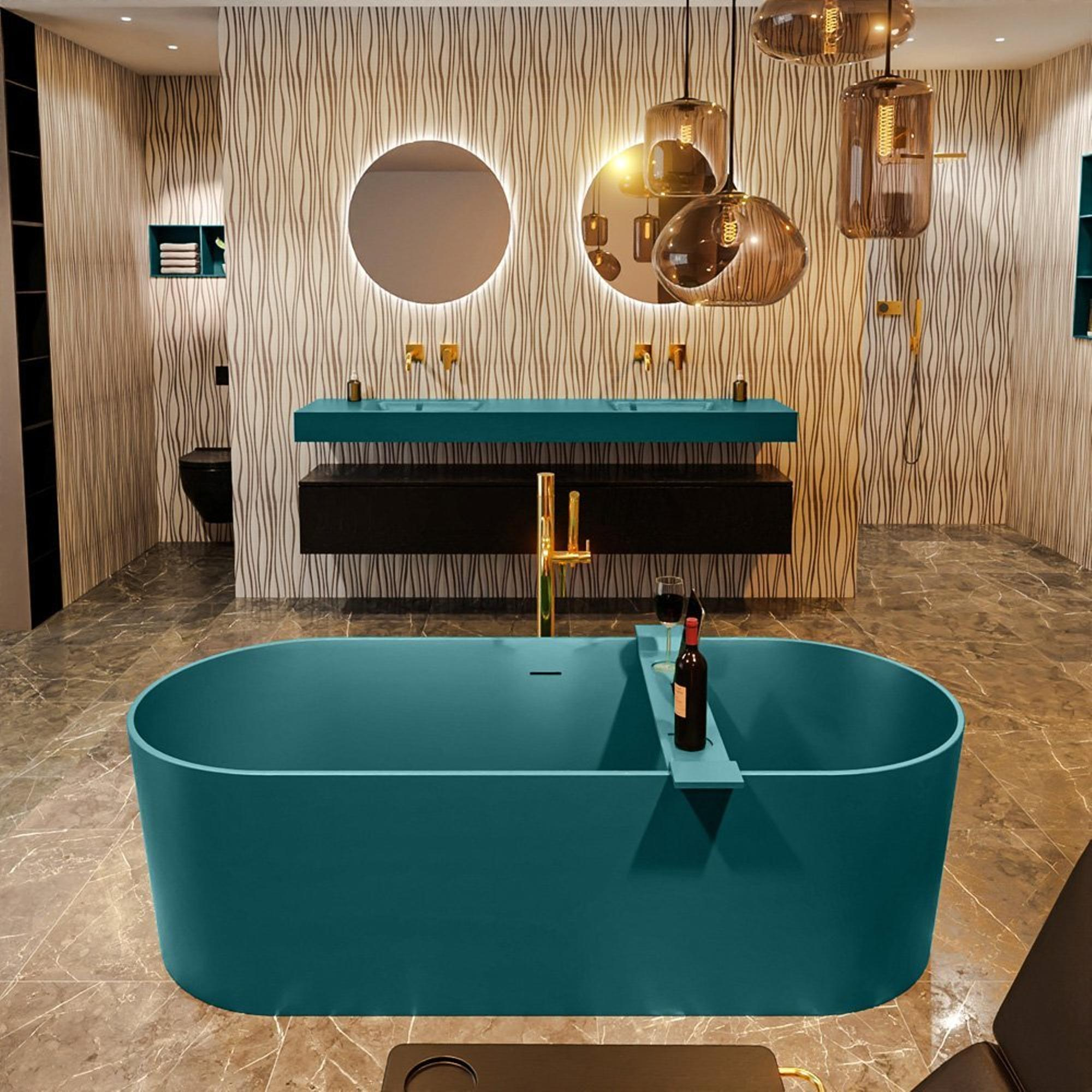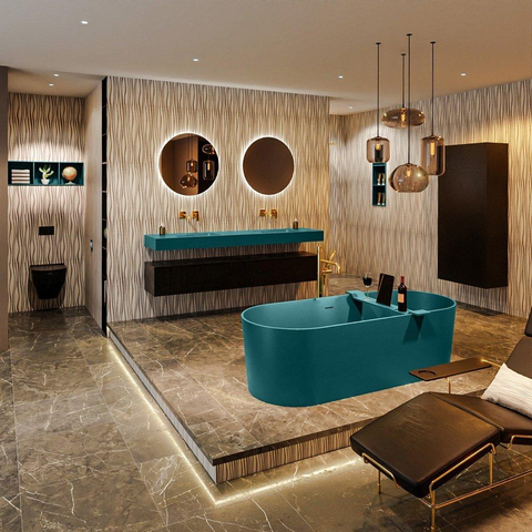 Avec sa forme ovale et sa pose autoportante, cette baignoire est faite pour être vue. La couleur particulière smag mate - une teinte de vert élégante à l’aspect doux et apaisant - donne immédiatement à votre salle de bains une impression de conception haut de gamme. Là où une baignoire blanche peut parfois se fondre dans l’espace, cette teinte apporte justement du contraste et du caractère. Cela en fait un excellent choix si vous travaillez avec des matériaux naturels comme le bois et la pierre, ou avec des carreaux sombres et de la robinetterie noire. Comme la couleur se retrouve aussi bien à l’intérieur qu’à l’extérieur de la baignoire, l’ensemble paraît épuré et apaisant. Ainsi, vous créez une salle de bains qui ressemble à un espace design soigneusement pensé, sans qu’elle paraisse froide ou impersonnelle.