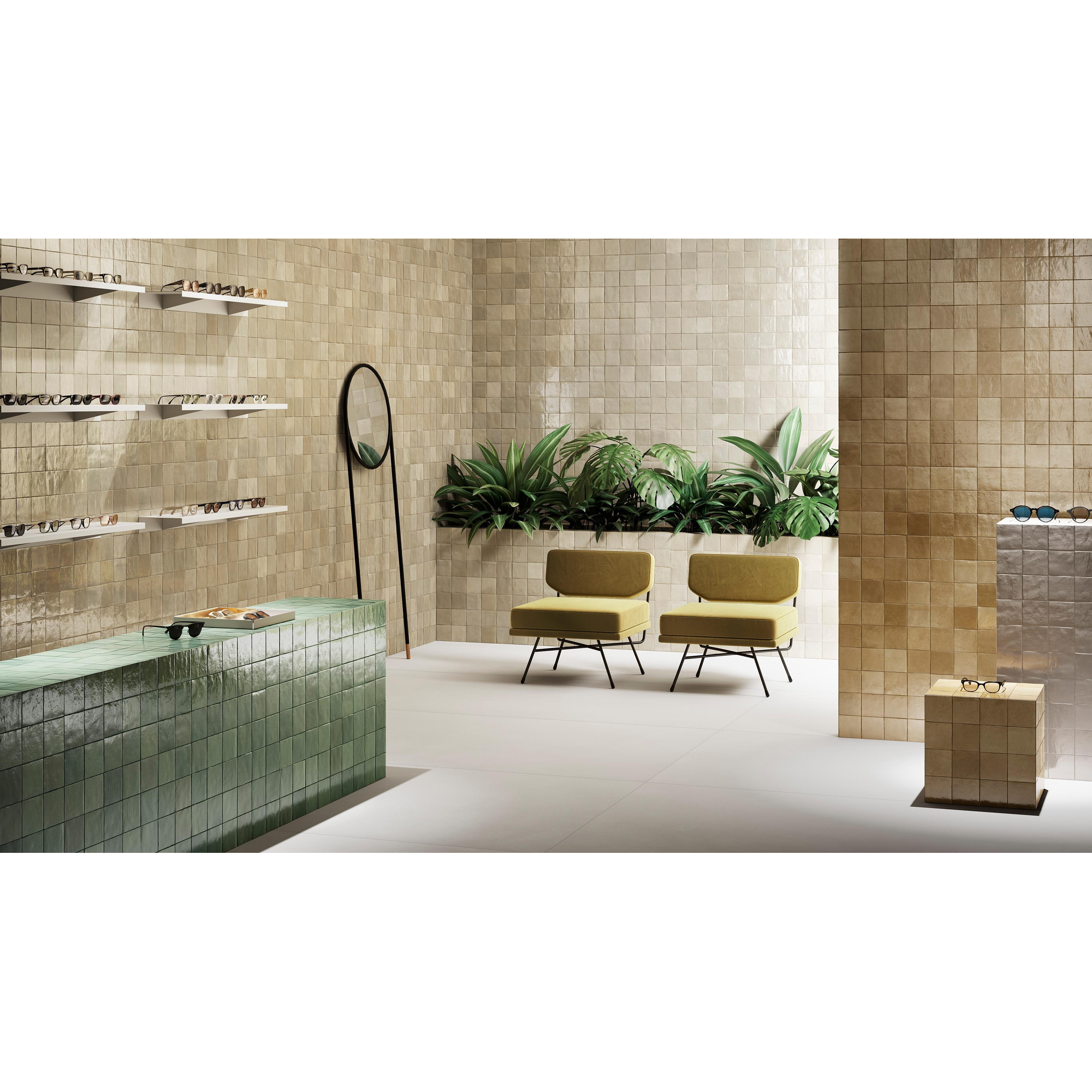 Le charme de ces carreaux muraux réside dans la simplicité affirmée de leur format et les nuances raffinées de la couche brillante. Grâce au look de type majolique, chaque carreau semble légèrement différent, ce qui crée un ensemble riche et artisanal. Au lieu d’une surface carrelée plane et monotone, vous créez ainsi un mur avec profondeur, dynamisme et caractère. La couleur blanc gesso se combine facilement avec des meubles en bois, des robinets noirs, des sols aspect béton ou des tons pastel doux. Vous pouvez ainsi vous orienter vers tous les styles : de l’ultra épuré et minimaliste au chaleureux et méditerranéen. Cette flexibilité rend ces carreaux particulièrement adaptés si vous souhaitez déjà tenir compte d’un futur relooking de votre salle de bains ou de votre cuisine.Format pratique pour des schémas de pose créatifs