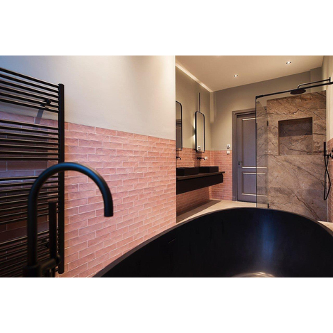 Si vous recherchez un carreau mural remarquable mais néanmoins raffiné pour votre salle de bains, vos toilettes ou votre cuisine, ce carreau allongé et brillant est un choix élégant. Son format étroit se prête parfaitement aussi bien aux petits qu’aux grands espaces : dans un petit espace WC, vous créez un effet ludique et spacieux, tandis que dans une grande salle de bains ou sur un mur arrière de cuisine, c’est justement le jeu de lignes raffiné qui est mis en valeur. La douce teinte rose confère une apparence chaleureuse et luxueuse qui se marie bien avec des tons neutres, un effet marbre, des accents bois ou des robinetteries noires mates. Grâce à la surface supérieure lisse et brillante, votre mur paraît toujours frais et lumineux, idéal si vous souhaitez créer une atmosphère d’hôtel chic sans que cela devienne trop chargé ou criard. Que vous habilliez un mur complet ou que vous optiez pour une bande d’accent derrière le meuble de salle de bains, avec ce carreau vous apportez chez vous une base intemporelle qui donne juste un peu plus de caractère à votre intérieur.