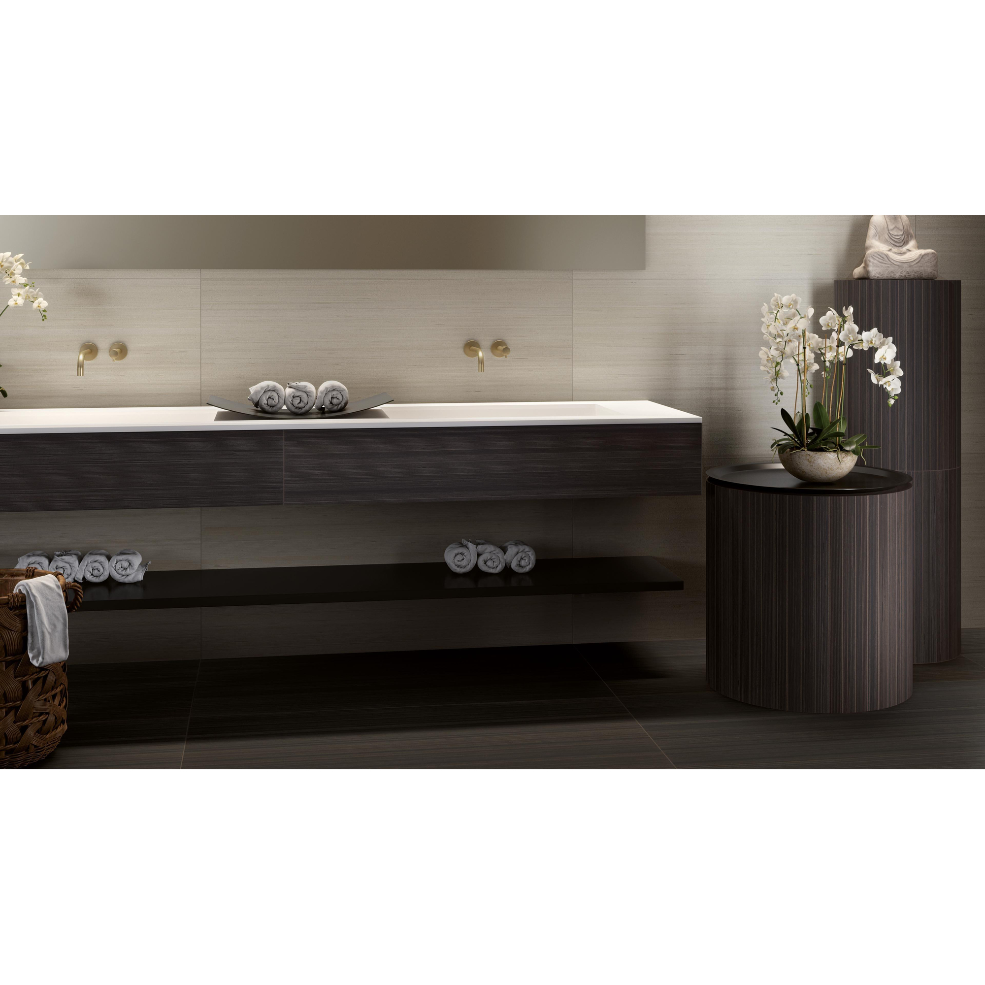 Le carreau décoratif en finition mate couleur wengé est parfait si vous recherchez un élément marquant chaleureux mais discret. La couleur brune à l’aspect décoratif s’intègre parfaitement dans les salles de bains style hôtel chic, les lofts modernes et les intérieurs chaleureux et naturels. Grâce aux bords rectifiés, vous pouvez travailler avec des joints étroits, de sorte que votre sol ou votre mur forme un ensemble homogène et calme et que le carreau lui-même joue le premier rôle. Utilisez-le comme carreau de sol ou de mur sur toute la surface, ou combinez-le en tant que mur d’accent derrière la baignoire ou dans la douche avec un carreau de base sobre ou à effet béton. Vous créez ainsi facilement un design luxueux qui donne l’impression de sortir d’un magazine de décoration intérieure.