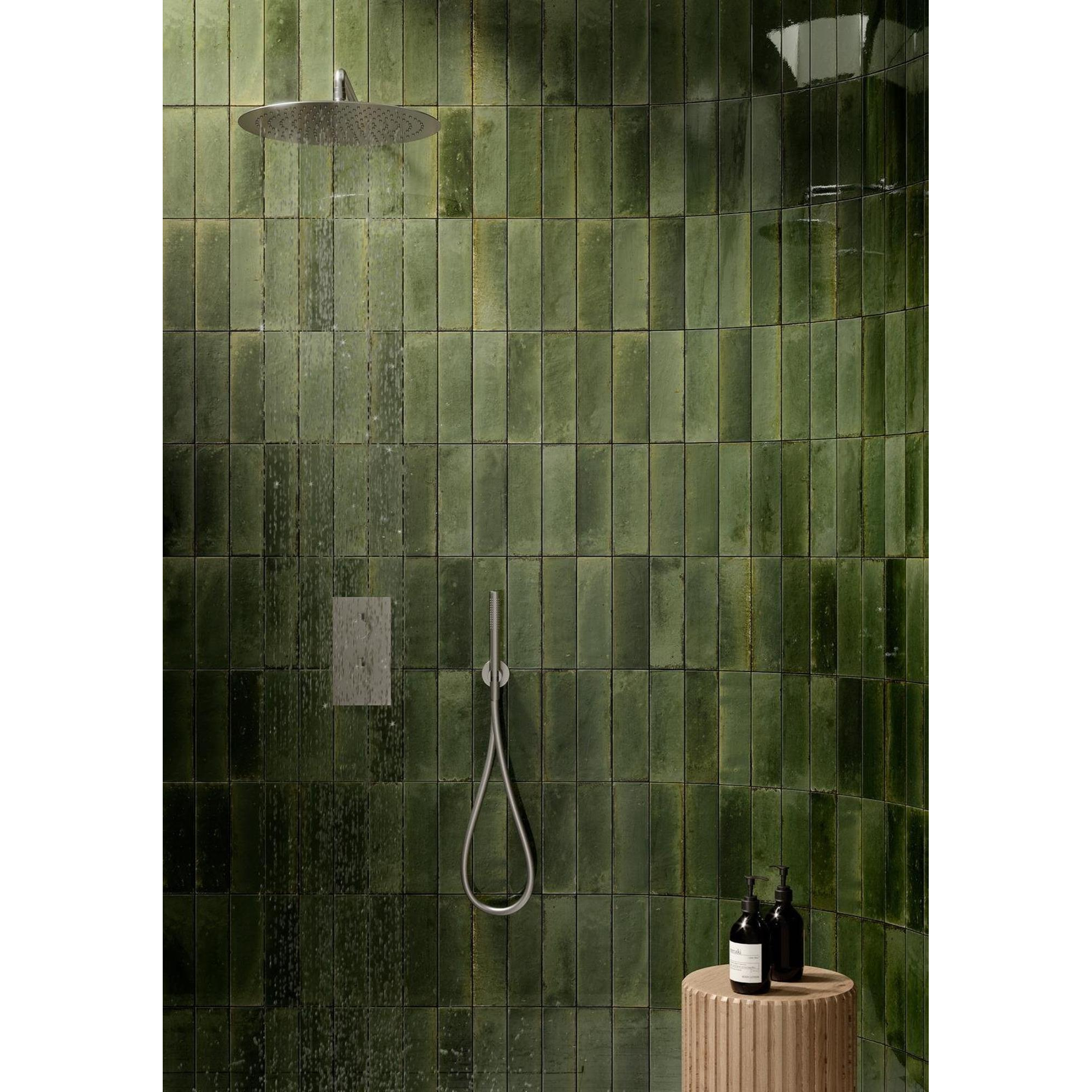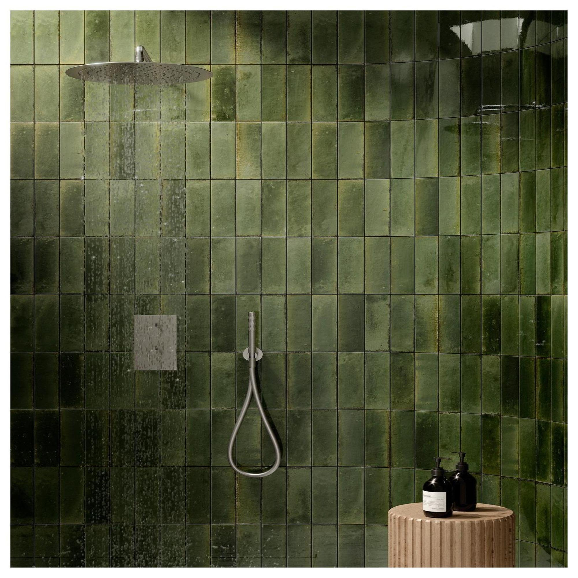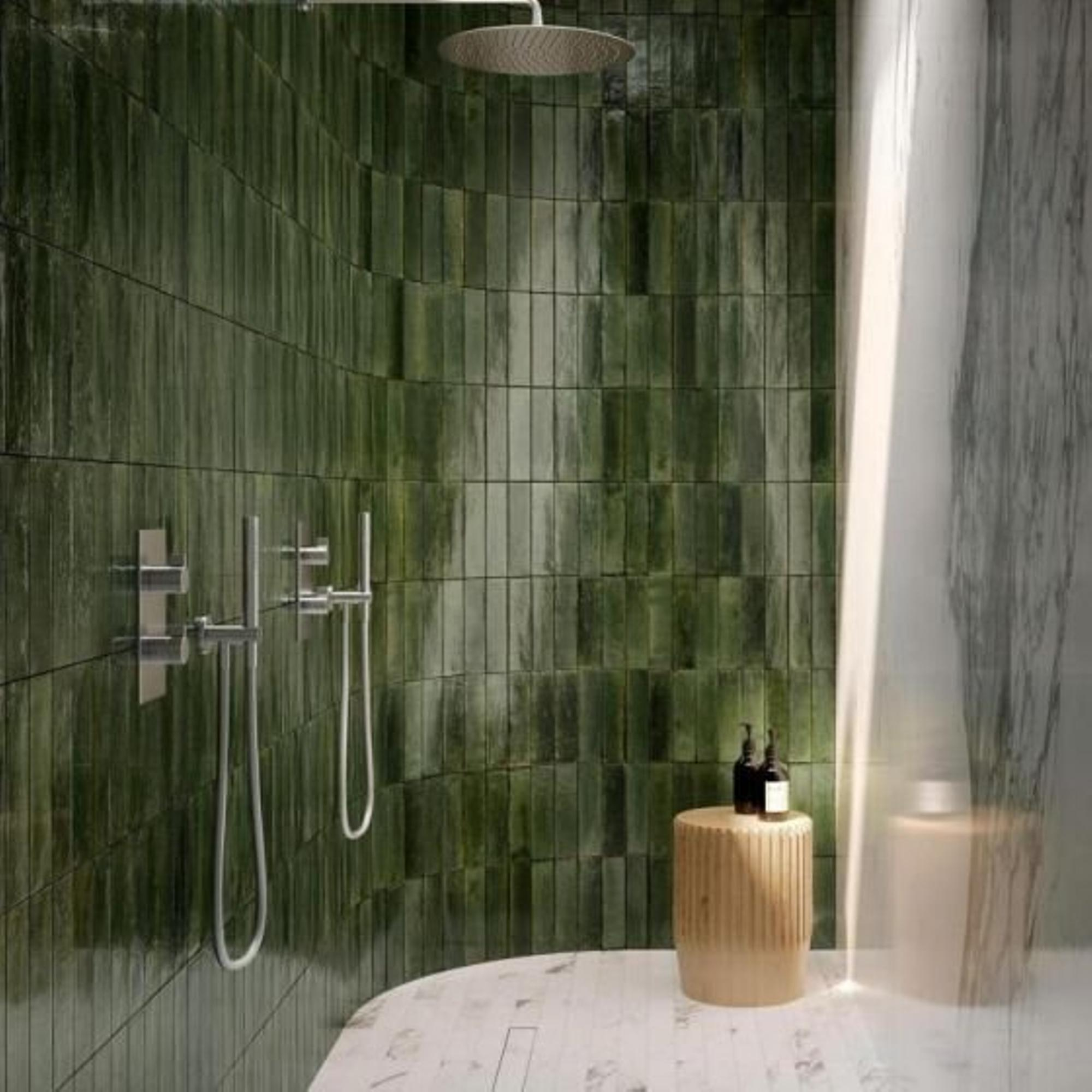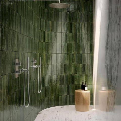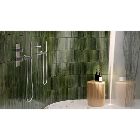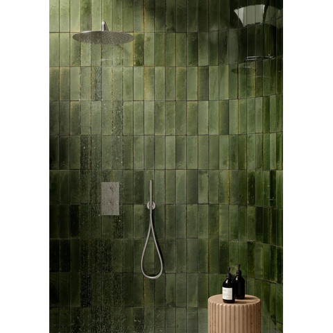 La teinte vert olive brillante et le subtil effet majolique assurent ensemble un aspect luxueux, presque comme une forme artisanale. Chaque carreau présente de légères différences de couleur et de tonalité (variation de couleur V3), de sorte que votre mur paraît vivant et plein de caractère plutôt que plat et ennuyeux. La brillance reflète magnifiquement la lumière, ce qui aide surtout dans les petites salles de bains à rendre l’espace plus ouvert et plus lumineux. Combinez la couleur verte avec des tons bois, une robinetterie noire ou une céramique blanche pour un contraste élégant. Vous créez ainsi facilement un style intemporel et personnel qui ne lassera pas rapidement.