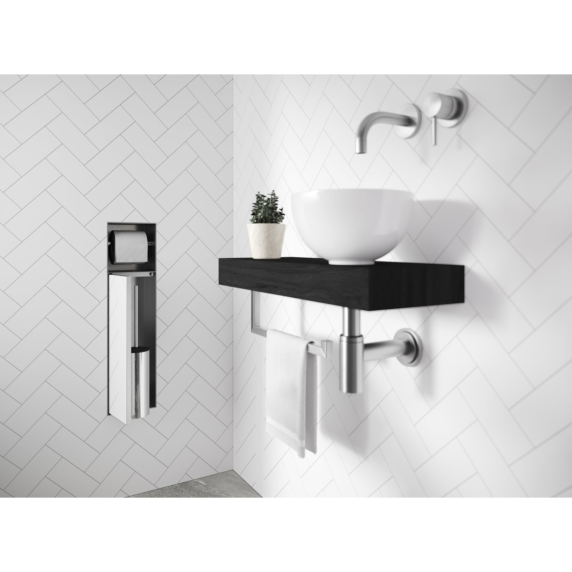 Cette unité encastrée intelligente est idéale si vous souhaitez des toilettes épurées et ordonnées, sans brosse de WC amovible sur le sol ni dérouleur de papier toilette encombrant au mur. Tout est soigneusement intégré dans la cloison, ce qui crée plus d’espace et de calme, notamment dans les petits WC ou les salles de bains modernes et minimalistes. Grâce à la façade carrelable, votre carrelage se poursuit harmonieusement et le mur forme un seul ensemble, tandis que la brosse et le rouleau de papier toilette restent directement à portée de main. Cela rend ce produit particulièrement adapté à ceux pour qui le design est important, mais qui accordent également de la valeur à l’hygiène, à la praticité et à une finition durable capable de supporter sans effort une utilisation intensive au quotidien.