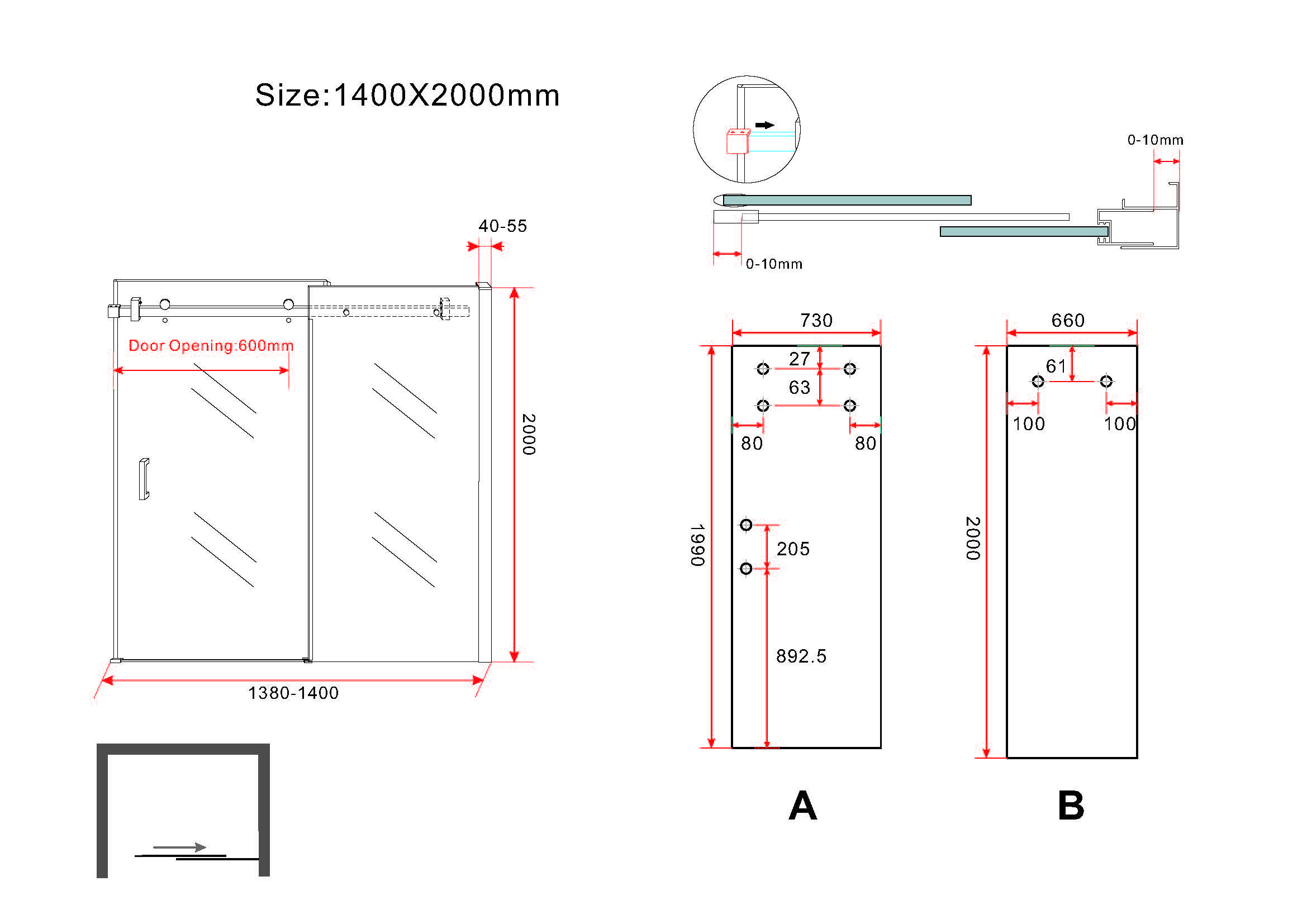 - Dimensions : 1400 x 2000 mm, adapté aux largeurs de niche de 138 à 139,5 cm