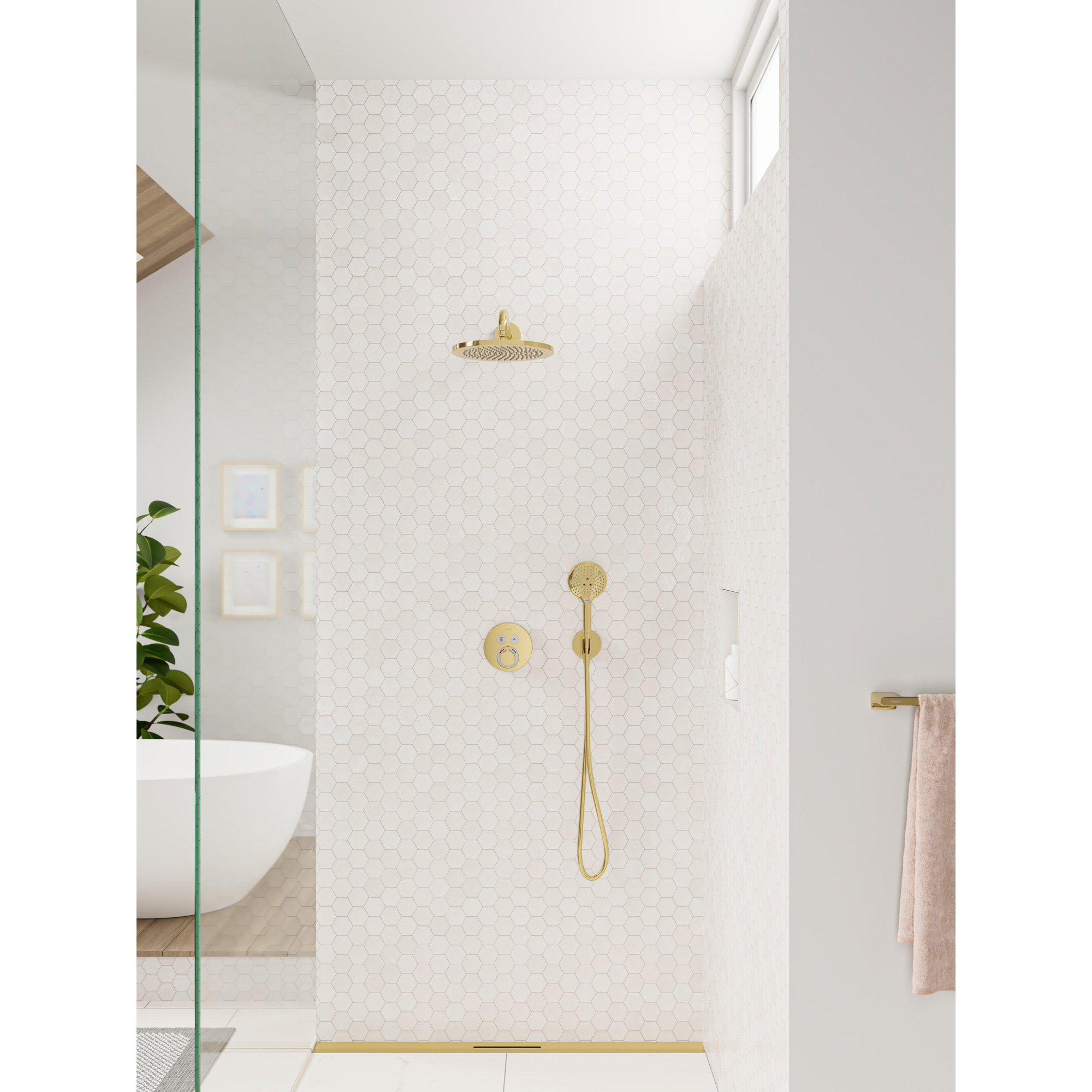 Cette douche de tête est un exemple de raffinement et de classe. La finition polished gold optic offre une apparence chaleureuse et luxueuse qui s'intègre parfaitement dans les salles de bains modernes et classiques. Le design rond avec un diamètre de 280 mm assure une répartition généreuse de l'eau, donnant immédiatement à votre salle de bains une mise à niveau élégante. Grâce à la plaque de recouvrement métallique, la pomme de douche est solide et durable, ce qui contribue à son apparence haut de gamme. Avec ce produit, vous ajoutez non seulement de la fonctionnalité, mais aussi une déclaration de design qui complète votre salle de bains.