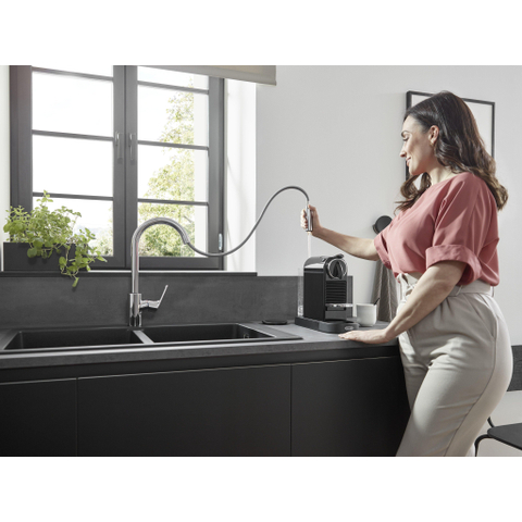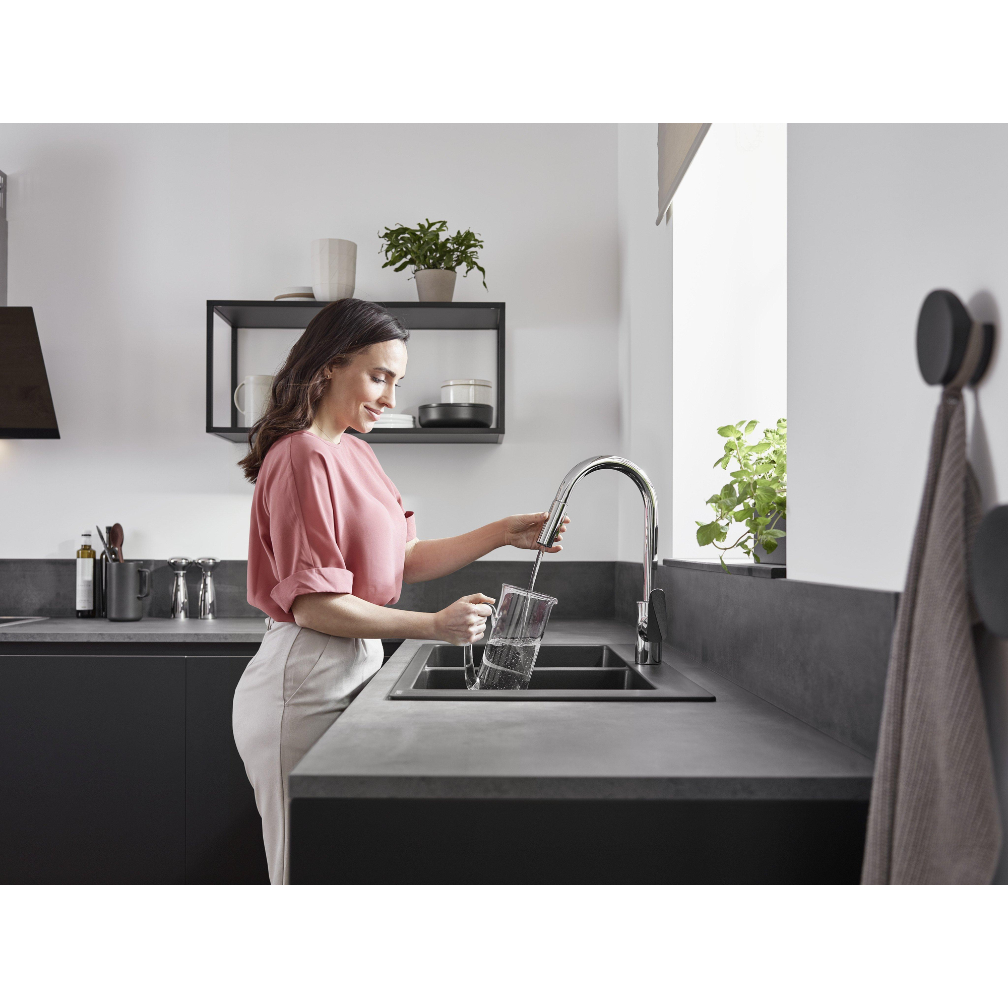 La douchette extractible à deux jets offre une flexibilité maximale en cuisine. Vous passez facilement d’un jet laminaire doux à un jet douche puissant, que vous pouvez également verrouiller pour un usage continu. La plage de rotation du robinet est réglable en deux étapes (110° et 150°), vous permettant d’adapter parfaitement le robinet à votre évier et à vos tâches. Le support magnétique MagFit maintient fermement la douchette en place, tandis que les flexibles de raccordement facilitent l’installation. Vous bénéficiez ainsi d’un confort d’utilisation optimal au quotidien.