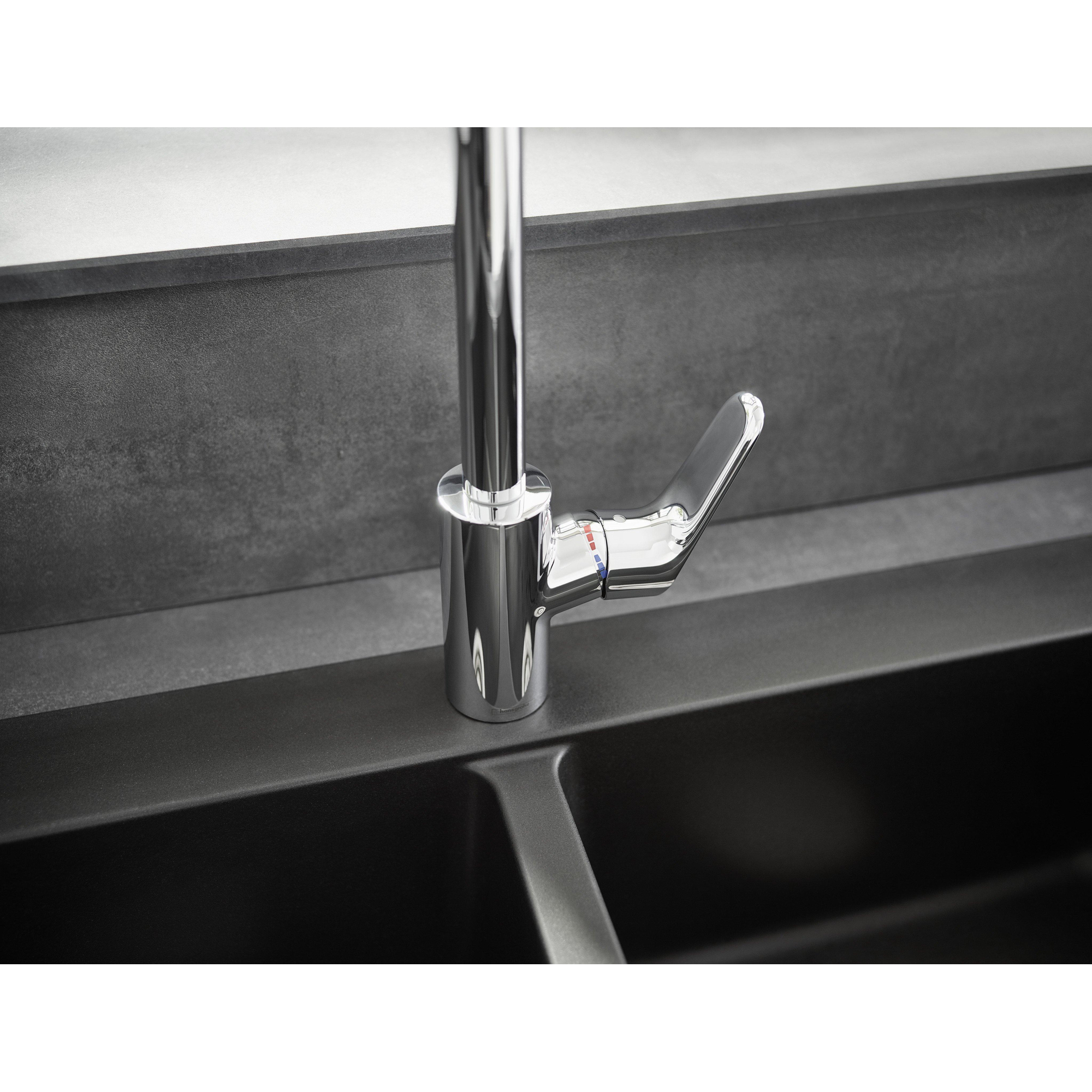 Avec ce mitigeur de cuisine, vous offrez à votre cuisine une mise à niveau élégante et pratique. Le design mince chromé s’intègre parfaitement dans toute cuisine moderne et offre un aspect frais et intemporel. Grâce à la douchette extractible à deux jets, vous pouvez facilement passer d’un jet laminaire à un jet douche puissant, idéal pour rincer les légumes ou nettoyer l’évier. Le robinet offre une large plage de rotation réglable en deux étapes, vous permettant de toujours trouver l’angle parfait pour vos tâches. De plus, ce robinet contribue à un mode de vie durable grâce à la technologie d’économie d’eau qui limite la consommation sans compromettre le confort. Vous profitez ainsi non seulement de la facilité d’utilisation, mais aussi d’un choix responsable qui complète votre cuisine.