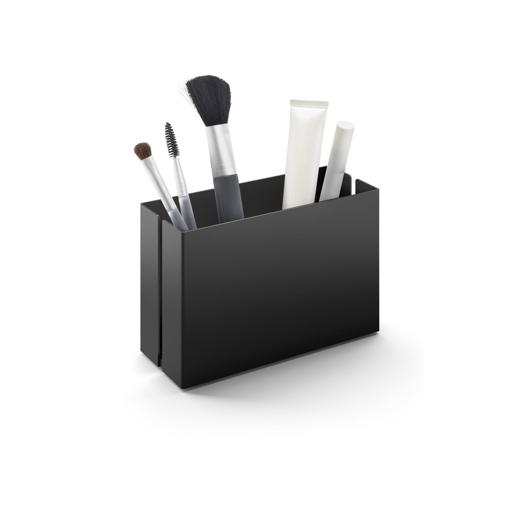 Le design épuré aux lignes droites et à la couleur noire mate uniforme apporte immédiatement de la sérénité à votre intérieur. Pas de détails criards, mais un élément subtil qui met en valeur les autres éléments de votre salle de bains. Comme le bac est ouvert, vous voyez en un coup d’œil ce qu’il contient et vous ne vous trompez plus pendant la course du matin. Le format compact de 15 x 6 x 9,7 cm est suffisamment grand pour les accessoires quotidiens, mais suffisamment petit pour ne pas gêner sur votre plan de lavabo ou votre étagère. Vous gardez ainsi votre salle de bains organisée et l’ensemble reste parfaitement équilibré.