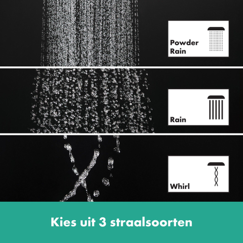 Avec trois types de jets différents – PowderRain, Rain et Whirl – vous choisissez vous-même votre façon de vous doucher. Le mode PowderRain produit des milliers de micro-gouttes fines qui enveloppent doucement, idéal pour une expérience relaxante. Le jet massage intensif Whirl stimule vos muscles et rafraîchit votre corps, tandis que le jet classique Rain offre un jet d'eau large et naturel. Grâce au bouton Select pratique, vous changez facilement de mode, même sous la douche. Profitez ainsi toujours du jet parfait, adapté à votre humeur et à vos besoins.