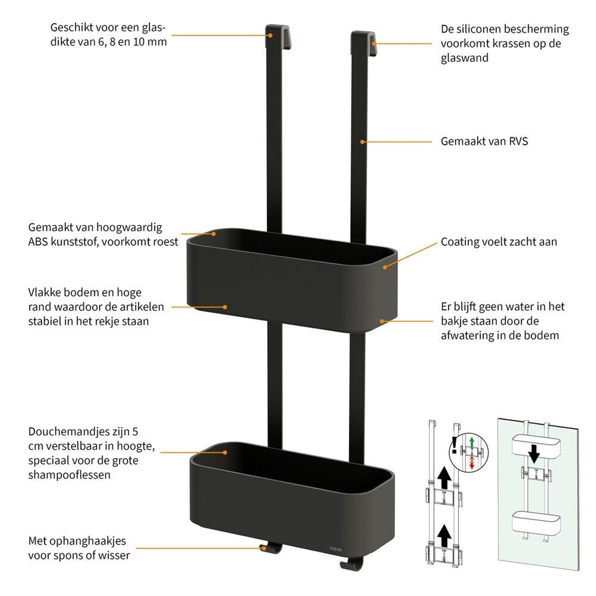 Ce panier de douche suspendu est un choix malin si vous recherchez plus de clarté et de sérénité dans votre douche, sans percer ni visser. Avec deux paniers spacieux, vous créez en une seule fois de la place pour le shampooing, le gel douche, les rasoirs et tous ces autres flacons qui se trouvent peut-être encore sur le sol ou sur de petites bordures étroites. Grâce à son design fin et vertical, ce panier s’intègre parfaitement aussi bien dans les petites que dans les grandes salles de bains, et il s’accorde très bien avec les intérieurs modernes, industriels et minimalistes grâce à la combinaison du noir avec des accents métalliques. Vous suspendez le panier facilement par-dessus une paroi ou une porte de douche, idéal si vous vivez en location ou si vous souhaitez préserver intact votre carrelage. Vous ajoutez ainsi en un rien de temps un espace de rangement pratique, sans faire de concessions à l’apparence de votre salle de bains.Gain de place et tout à portée de main