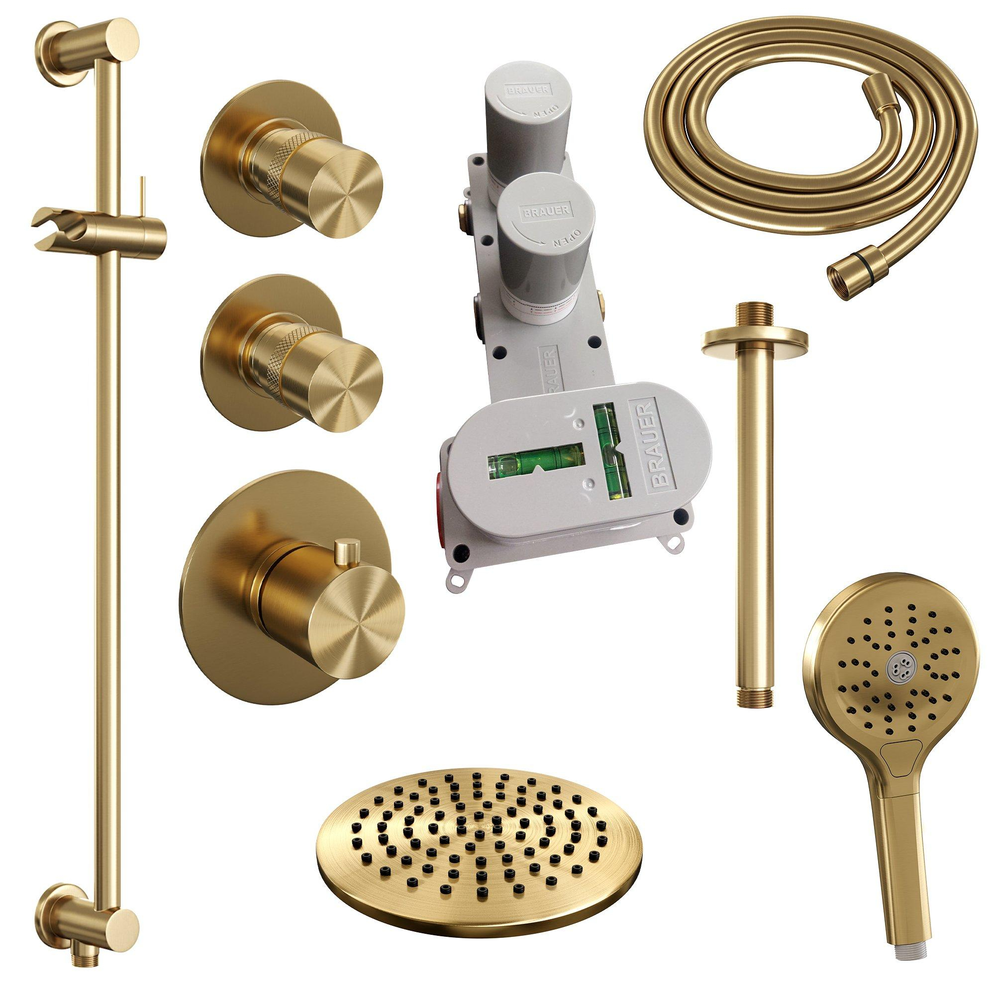 Brauer Gold Edition Ensemble de douche pluie encastré - douche principale 20cm - bras plafond 20cm - 3 boutons lisses - douchette ronde 3 positions - PVD - or brossé