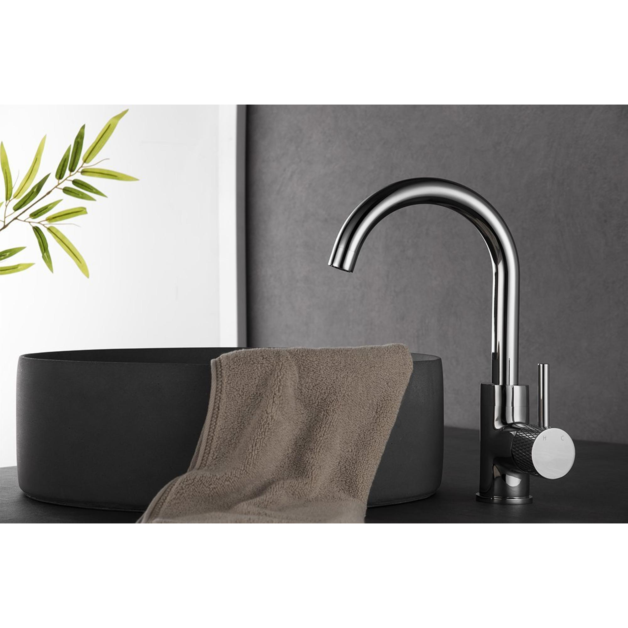 Ce mitigeur est un excellent choix pour ceux qui recherchent une solution élégante et fonctionnelle pour un lavabo sur pied. Grâce au design nervuré et à la finition chrome, ce mitigeur s’intègre parfaitement dans des salles de bains modernes et contemporaines où l’attention au détail et à la qualité est primordiale. Le bec pivotant rend l’utilisation flexible et pratique, idéal pour les lavabos qui ne sont pas placés directement contre le mur. Notez que ce mitigeur, en raison de la longueur du levier et du mécanisme de commande, n’est pas adapté à une installation directement contre le mur, mais est conçu pour une pose sur pied avec suffisamment d’espace autour du lavabo.