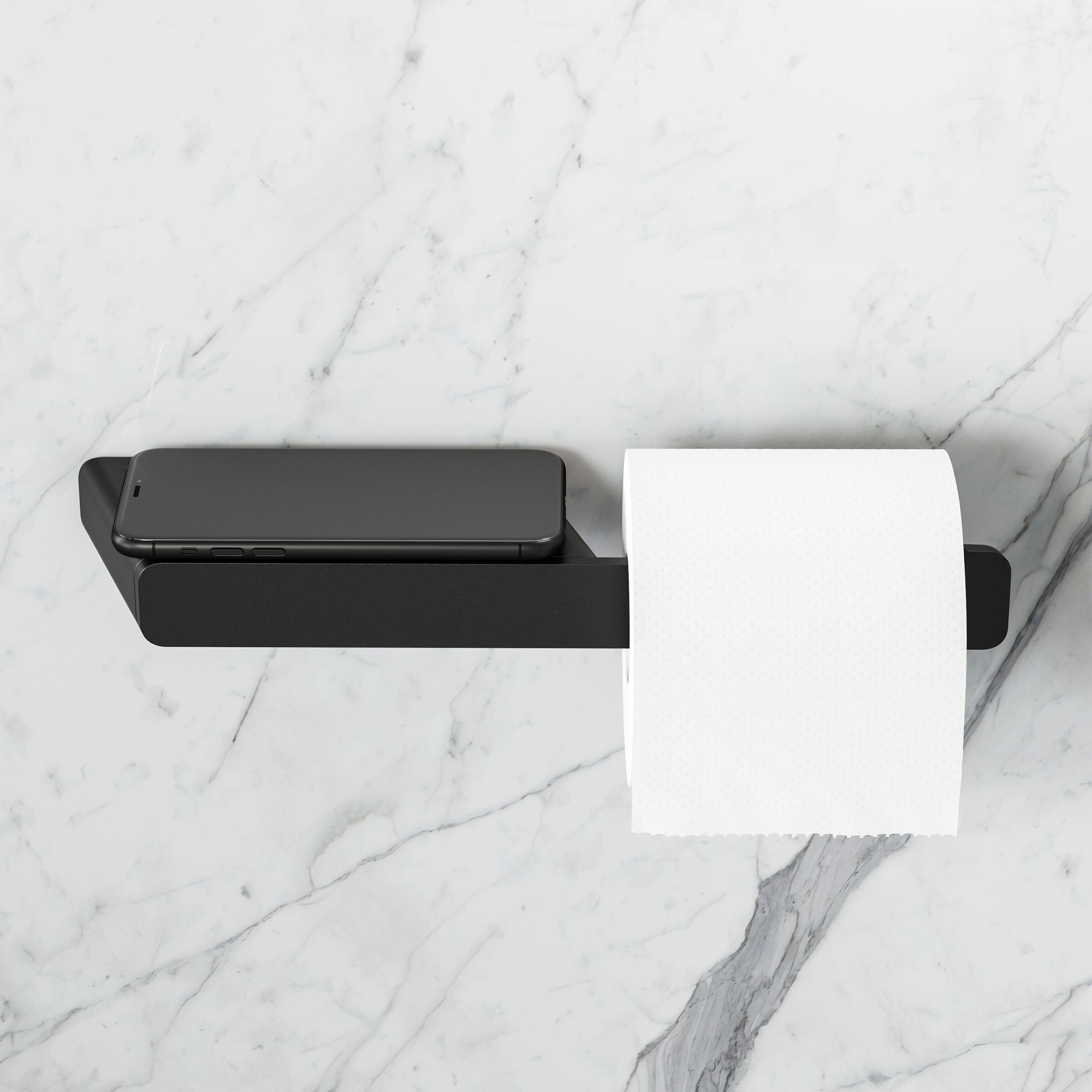 Avec ce porte-rouleau de papier toilette élégant avec tablette intégrée, vous ajoutez en une seule fois du style et de la fonctionnalité à vos toilettes ou à votre salle de bains. La conception minimaliste et la finition noire mate s’accordent parfaitement avec les intérieurs modernes, industriels et style hôtel chic. Grâce à sa largeur fine, cet accessoire est idéal aussi bien pour les petits WC que pour les salles de bains plus spacieuses, où vous recherchez un ensemble épuré et ordonné. La tablette offre un emplacement pratique pour, par exemple, votre téléphone, vos clés ou un diffuseur de parfum, afin que vous ne deviez plus jamais hésiter sur l’endroit où les poser. Si vous cherchez un accessoire qui supporte sans effort une utilisation intensive tout en offrant une apparence luxueuse, alors il s’agit d’un choix particulièrement judicieux.