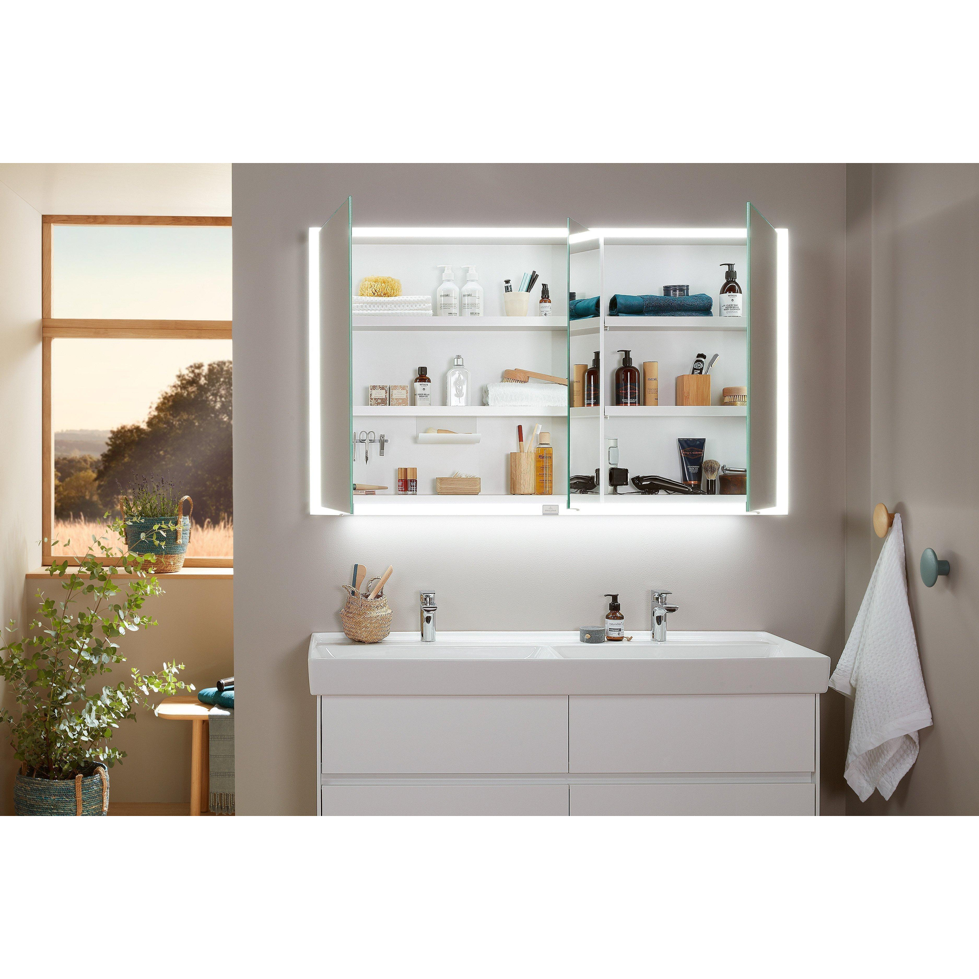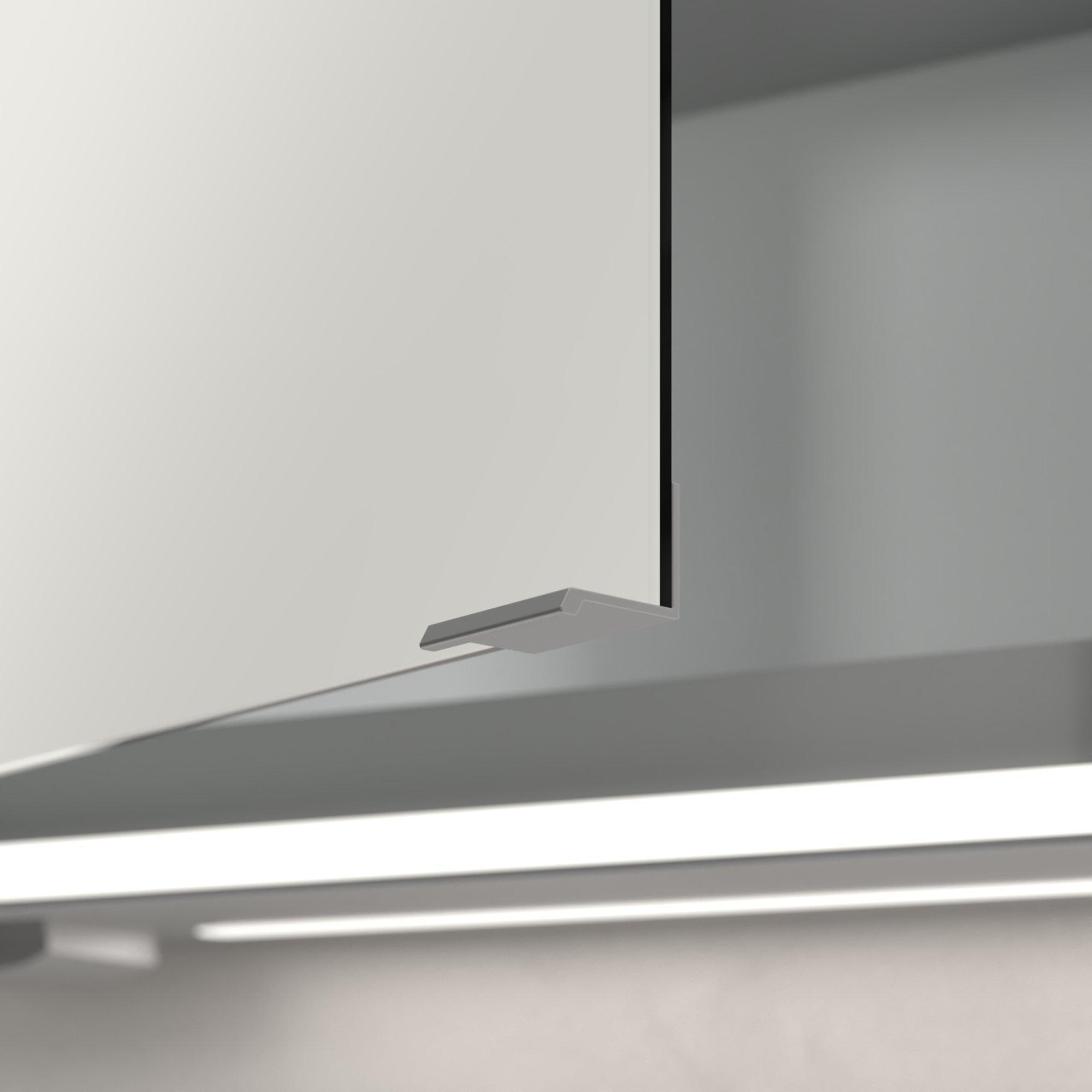 Le bandeau lumineux LED périphérique assure un éclairage uniforme de votre visage, sans ombres marquées. Idéal pour se raser, se maquiller ou prendre soin de sa peau. La température de couleur est réglable en continu, d’un blanc lumière du jour frais pour une netteté maximale à un blanc chaud pour un rituel du soir relaxant. De plus, vous pouvez varier l’intensité lumineuse pour obtenir exactement l’ambiance que vous préférez. L’éclairage intégré du lavabo illumine également le plan sous l’armoire, afin que vous voyiez bien ce que vous faites. Grâce au capteur situé sur la partie inférieure, vous allumez et éteignez l’éclairage facilement sans toucher de boutons, ce qui est non seulement confortable mais aussi particulièrement hygiénique.
