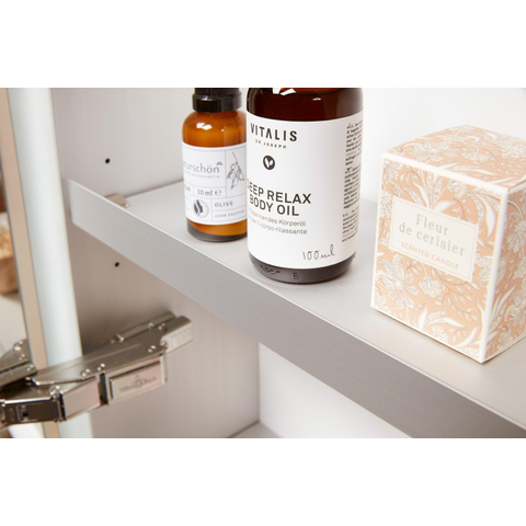 Avec trois portes et une largeur de 130 cm, cette armoire de toilette offre un espace de rangement étonnamment généreux. Les portes miroir double face vous donnent une visibilité parfaite sous différents angles, tandis que le caisson entièrement miroir crée un effet luxueux et spacieux dans la salle de bains. À l’intérieur, vous trouverez des étagères en aluminium réglables en hauteur avec rebord surélevé, de sorte que flacons, pots et maquillage restent bien en place et ne tombent pas. Les étagères sont faciles à nettoyer, ce qui rend l’entretien beaucoup plus simple. Deux prises de courant intégrées à l’intérieur et une prise externe supplémentaire rendent le branchement d’appareils électriques tels que brosses à dents, rasoirs ou sèche-cheveux très pratique. Des éléments supplémentaires comme le miroir grossissant, la barre magnétique et la tablette de dépose vous aident à organiser soigneusement et clairement les petits objets.