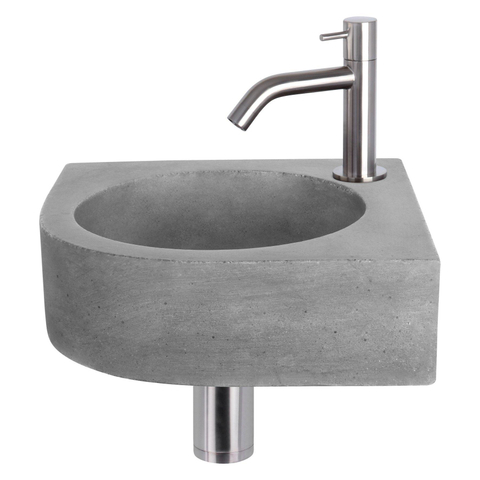 Si vous recherchez une solution compacte et élégante pour une petite salle de bains, des toilettes ou une niche étroite, alors un lave-mains d’angle en béton est un choix judicieux. Grâce à sa forme triangulaire, il s’intègre facilement dans un angle, de sorte que l’espace de circulation reste libre et que la pièce paraît optiquement plus grande. Le matériau robuste et la couleur gris foncé moderne donnent à vos toilettes ou à votre petite salle de bains un look industriel et brut qui se marie parfaitement avec des robinets et des accessoires noirs, en inox ou colorés. Grâce à son format subtil, ce type de lave-mains est idéal pour les habitations où chaque centimètre compte, des appartements en ville aux maisons familiales, mais aussi pour les espaces horeca et les bureaux où fonctionnalité, esthétique et facilité d’entretien doivent aller de pair.