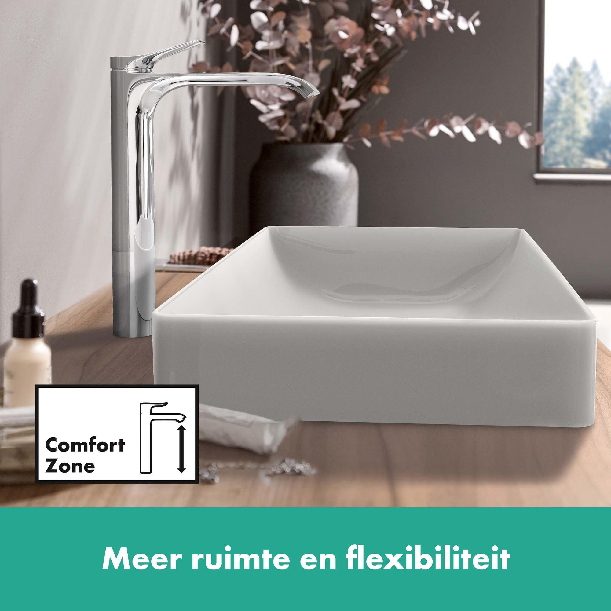Avec une ComfortZone de 250 mm, ce robinet offre une liberté de mouvement supplémentaire, parfait pour les lavabos sur pied où vous souhaitez exploiter l'espace sans compromettre la commodité. Le jet d'eau large procure une expérience agréable, tandis que la limitation de température réglable vous protège contre l'eau trop chaude. De plus, le robinet est compatible avec les chauffe-eau instantanés et s'installe facilement grâce à des flexibles de raccordement flexibles. Vous bénéficiez ainsi d'une solution fiable et sûre qui s'adapte aisément à vos besoins en salle de bains.