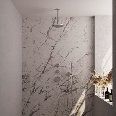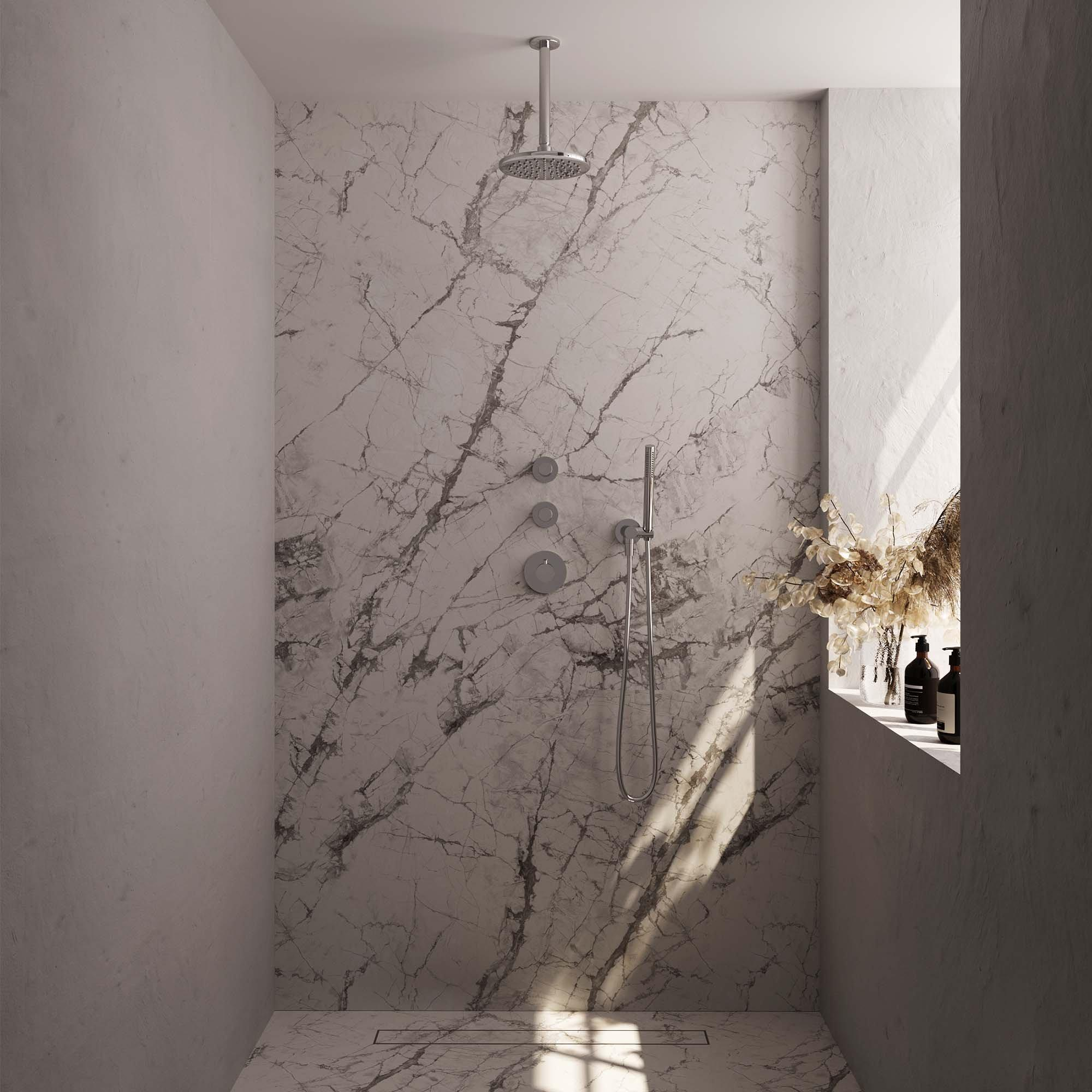 - Montage moderne au plafond : aspect minimaliste et grande liberté de mouvement dans la douche.