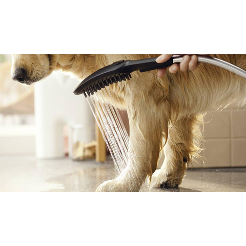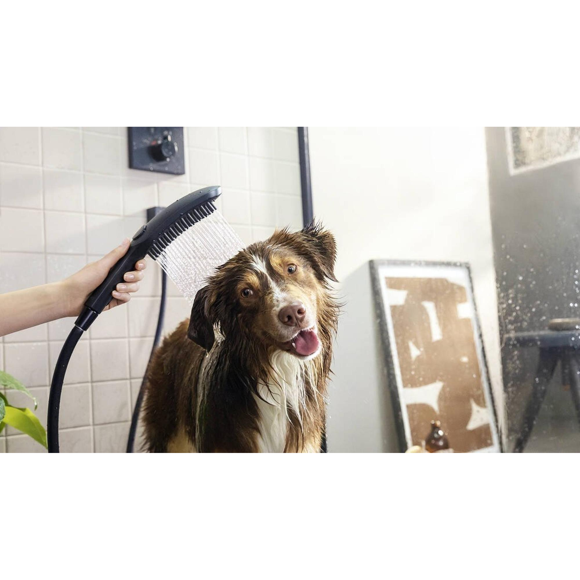 Avec cette douchette, vous avez tout le contrôle en main. Le bouton pratique sur la poignée règle le volume d'eau, de sorte qu'une pression active le jet complet et que le relâchement réduit automatiquement l'eau. Cela signifie que vous avez les deux mains libres pour soigner votre chien, sans gaspiller d'eau inutilement. De plus, les buses flexibles sont parfaites pour rincer soigneusement le shampooing, même dans un sous-poil épais. La tête de douche s'adapte facilement aux flexibles de douche standard et convient également pour une utilisation avec des tuyaux d'arrosage, offrant ainsi une polyvalence supplémentaire. Le lavage de votre chien devient ainsi beaucoup plus facile et efficace.