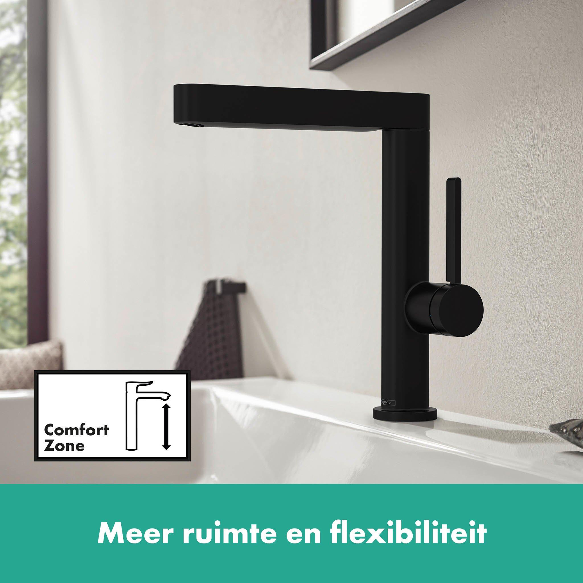 Avec une ComfortZone de 230 mm et une sortie pivotante de 120°, ce robinet offre une grande liberté de mouvement lors de l'utilisation. La haute sortie facilite le remplissage des seaux et le lavage des cheveux de manière simple et confortable. La garniture de vidage PushOpen fournie fonctionne sans tige de traction et s'accorde parfaitement avec le design minimaliste. De plus, une limitation de température réglable assure une sécurité supplémentaire, vous protégeant toujours contre l'eau trop chaude. Les flexibles de raccordement rendent également le montage rapide et facile.