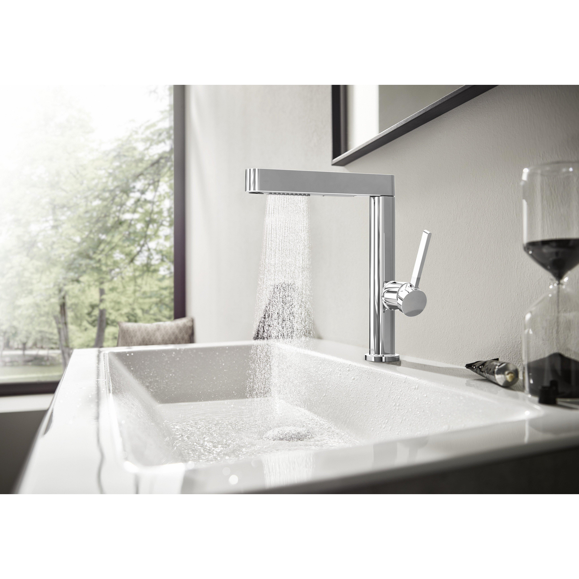 Le bec extractible offre une flexibilité sans précédent, vous permettant d’accomplir facilement différentes tâches. Que vous vouliez rapidement laver vos cheveux, remplir un petit bain pour bébé ou rincer le lavabo, d’une simple pression vous passez d’un jet laminaire cristallin à un jet doux PowderRain. Cela rend l’utilisation du robinet non seulement agréable, mais aussi efficace. La fonction de réinitialisation intégrée garantit que le robinet revient toujours au jet standard, pour éviter toute surprise.