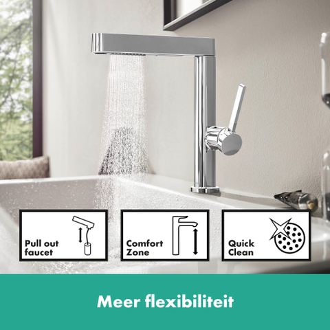 Avec ce robinet design, vous offrez à votre salle de bains une mise à niveau moderne et fonctionnelle. Le design épuré et géométrique assure une apparence intemporelle qui s’intègre facilement à tous les styles. Grâce aux fonctions intelligentes, la facilité d’utilisation est portée à un niveau supérieur : le bec est flexible et extensible jusqu’à 50 centimètres, idéal pour laver rapidement les cheveux, remplir des seaux ou rincer le lavabo. La combinaison de la forme et de la fonction fait de ce robinet un partenaire indispensable dans votre routine quotidienne. La finition chrome offre non seulement un brillant éclatant, mais est aussi facile à nettoyer, ce qui permet à votre salle de bains de toujours paraître fraîche et soignée. Ainsi, le cœur de votre salle de bains devient un endroit où vous aimez passer du temps, soutenu par une technologie innovante qui rend la vie un peu plus facile.