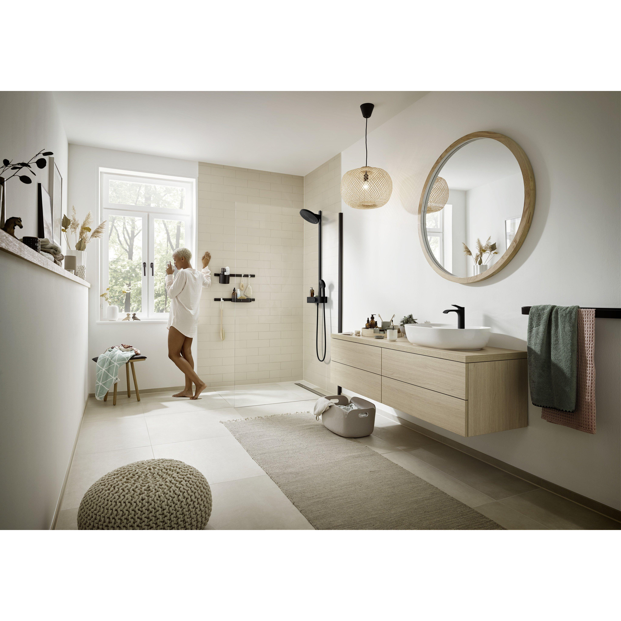 Les types de jets polyvalents de la douche de tête et de la douchette vous offrent un large choix : du doux PowderRain au jet massant stimulant. Les boutons Select fonctionnent intuitivement et rendent l’allumage et l’extinction de la douche aussi simples que l’utilisation d’un interrupteur. Grâce au tube de montée plat et au support intégré pour la douchette, vous bénéficiez d’une liberté de mouvement maximale et tout est toujours à portée de main. La grande tablette offre de la place pour tous vos produits de douche, gardant votre salle de bains propre et organisée. De plus, l’installation est facile grâce aux raccords S standard.