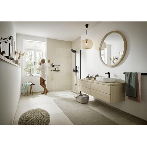 Le design noir mat donne à votre salle de bains une apparence moderne et luxueuse, intemporelle. Cette couleur s’harmonise aisément avec divers styles d’intérieur, du style industriel épuré au minimalisme chaleureux. Les coins arrondis et le profil élancé créent un ensemble élégant qui attire immédiatement le regard. Grâce à la tablette intégrée, vous gardez vos produits préférés bien rangés et visibles, contribuant à une atmosphère ordonnée et accueillante. Avec ce système de douche, vous ajoutez une touche stylée qui élève votre salle de bains à un niveau supérieur.