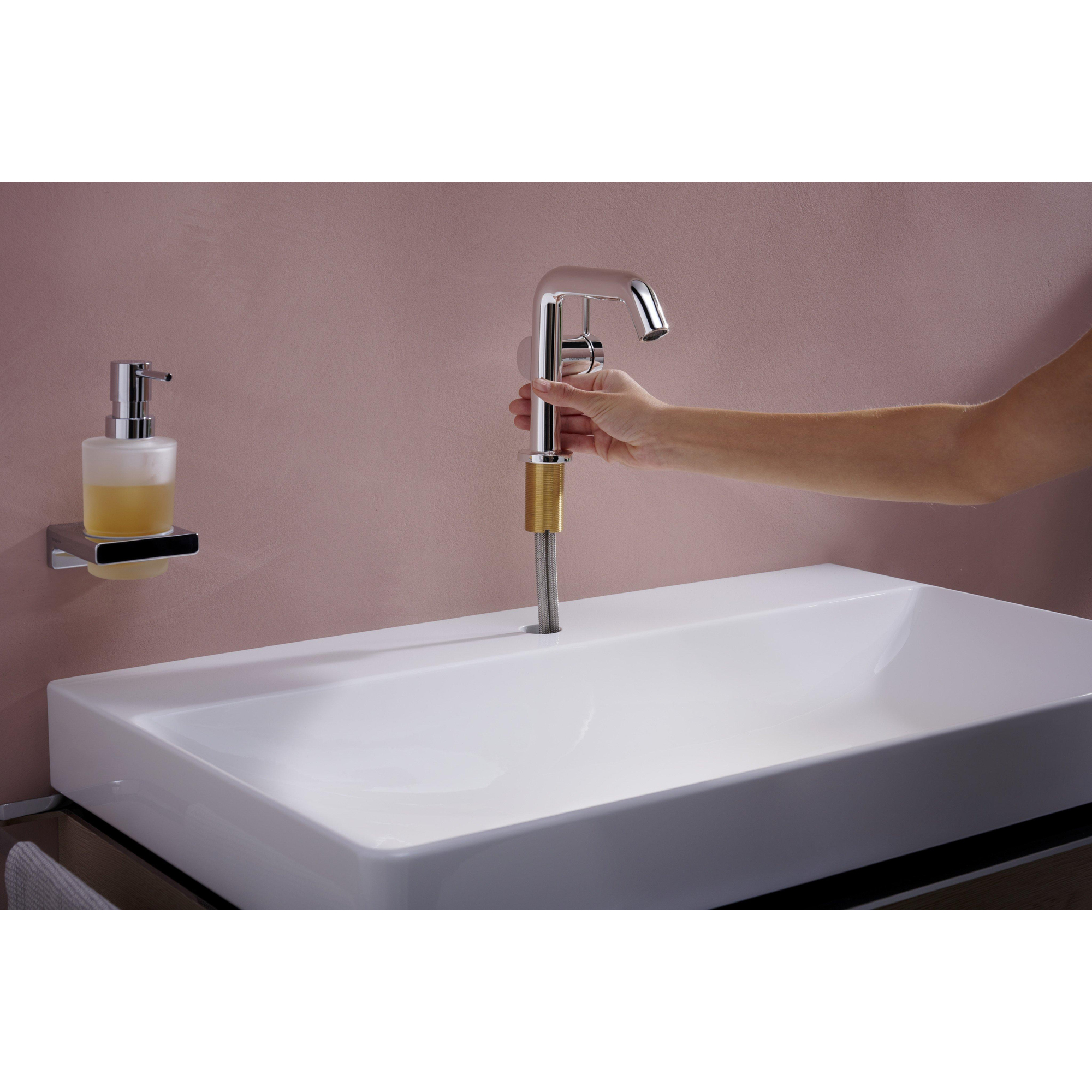 Avec ce distributeur de savon, vous offrez à votre salle de bains une mise à niveau élégante et pratique. Le design épuré et moderne ajoute une touche raffinée, tandis que la facilité d'utilisation est immédiatement perceptible. Grâce au récipient en verre contenant environ 200 ml de savon liquide, vous avez toujours suffisamment de savon à portée de main. À chaque pression sur la pompe, la quantité exacte de savon est délivrée, évitant ainsi le gaspillage. Cette combinaison d'élégance et de fonctionnalité fait que votre salle de bains n'est pas seulement belle, mais aussi plus efficace. Le design minimaliste s'harmonise parfaitement avec les robinets et accessoires modernes, créant un ensemble harmonieux qui invite à la détente et au soin.