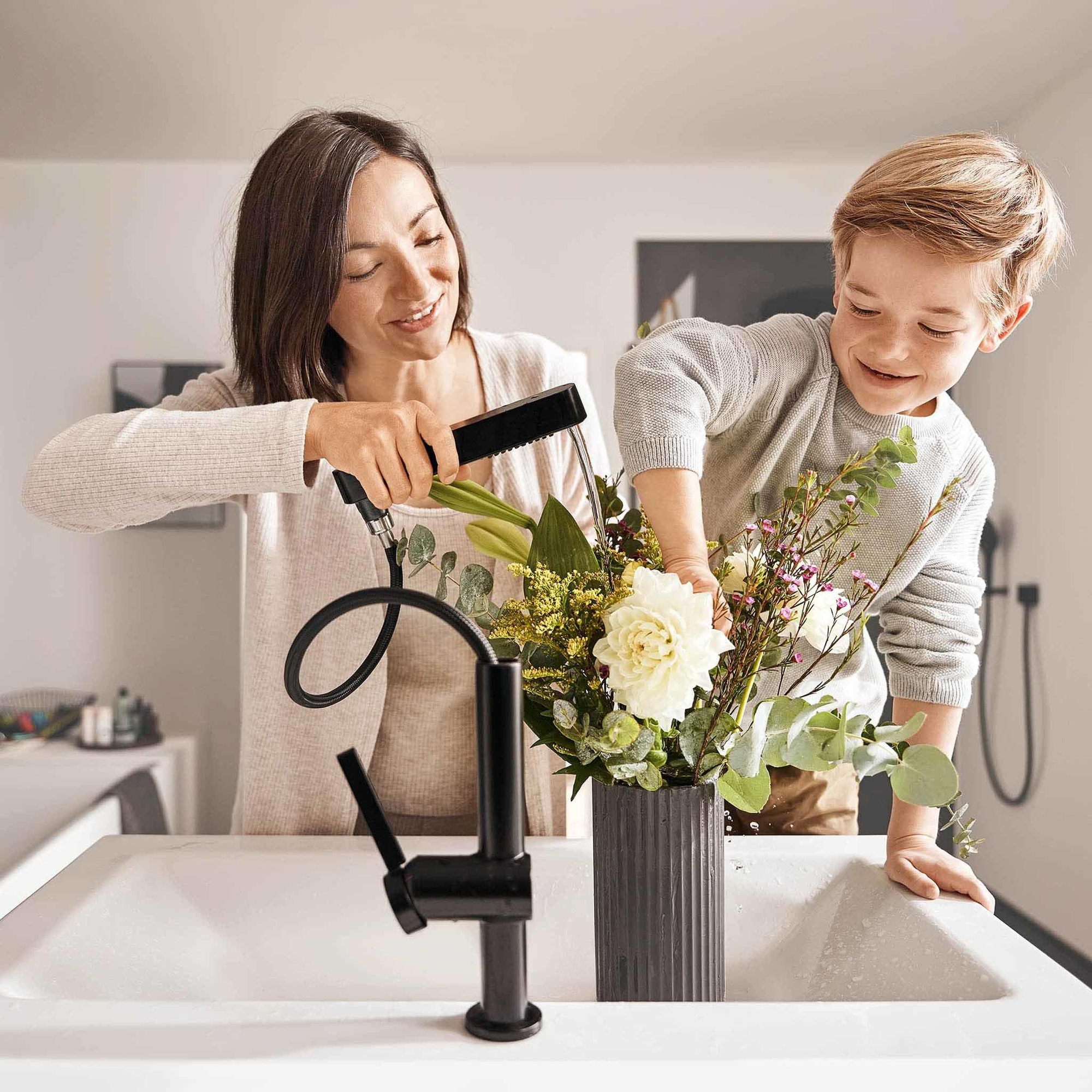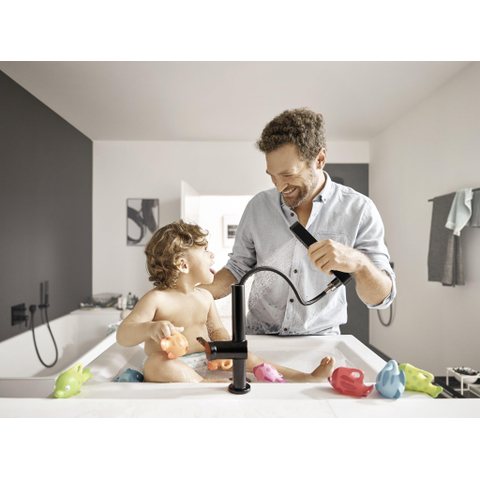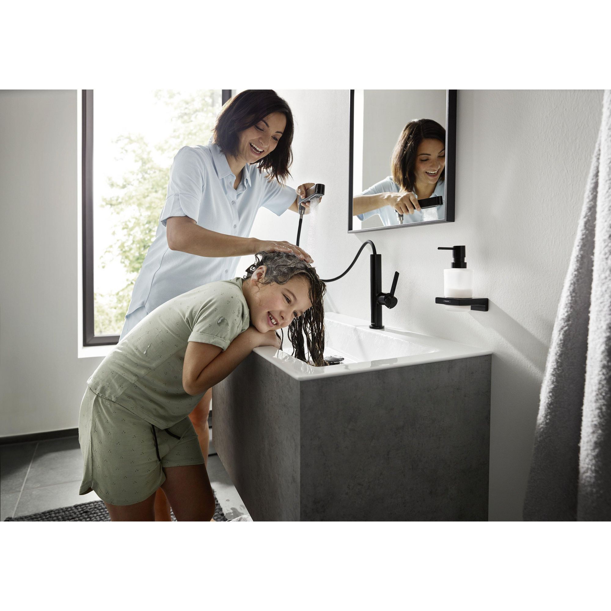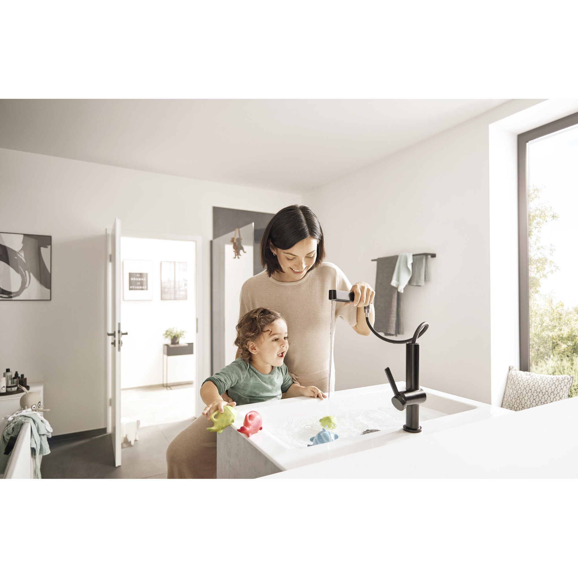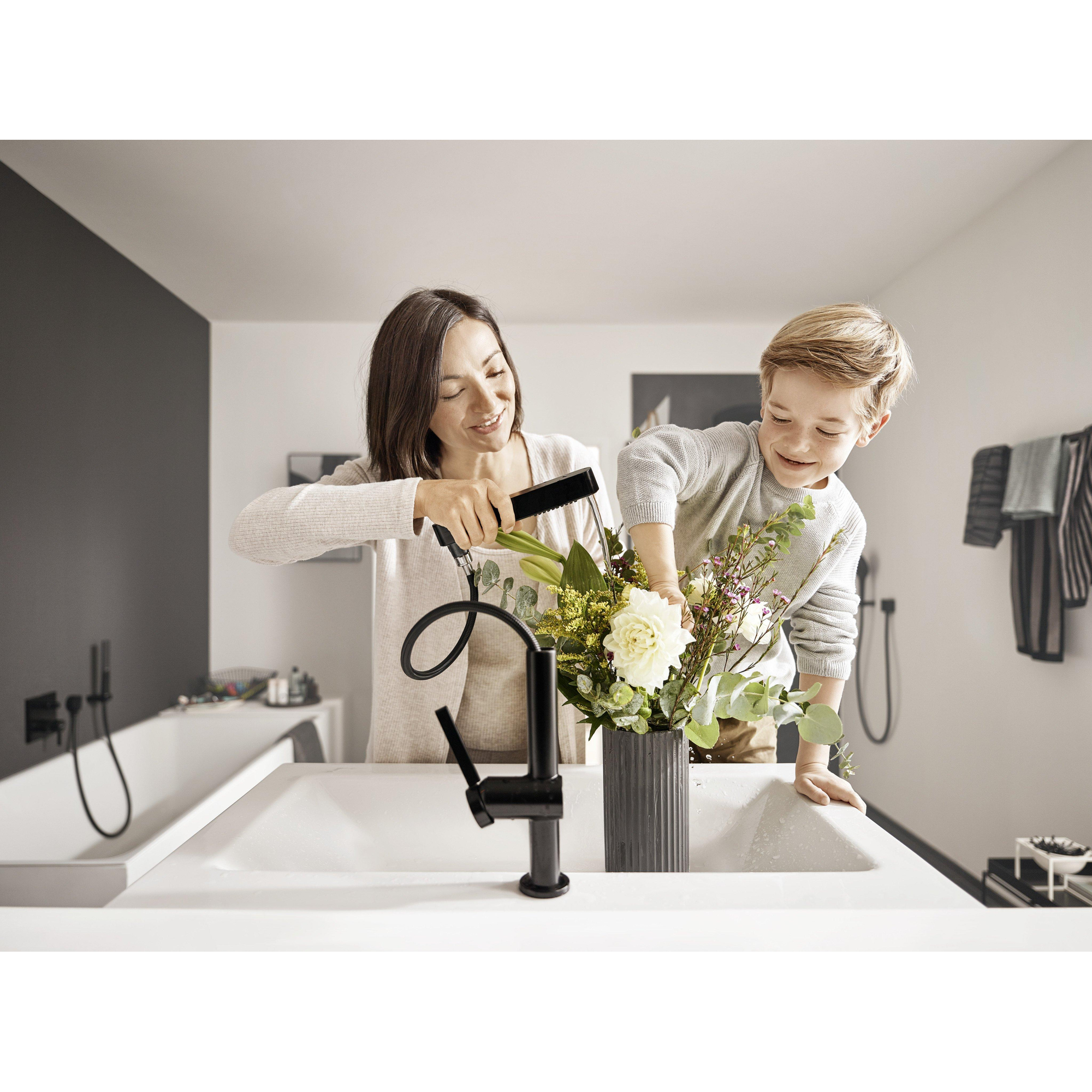 Avec ce mitigeur design, vous offrez à votre salle de bains une mise à niveau moderne et fonctionnelle. Les lignes épurées et la finition mat noir apportent une touche élégante et intemporelle qui s'intègre parfaitement dans divers styles de salle de bains. Grâce aux fonctions intelligentes telles que la douchette extractible et le bouton Select pratique, vous bénéficiez chaque jour de commodité et de confort. Que vous souhaitiez rapidement laver vos cheveux, remplir un bain pour bébé ou rincer le lavabo, ce mitigeur répond parfaitement à vos besoins. La combinaison de la forme et de la fonction rend l'utilisation non seulement agréable, mais aussi étonnamment polyvalente. Ainsi, votre lavabo devient le cœur de la salle de bains où vous commencez et terminez chaque jour avec plaisir.