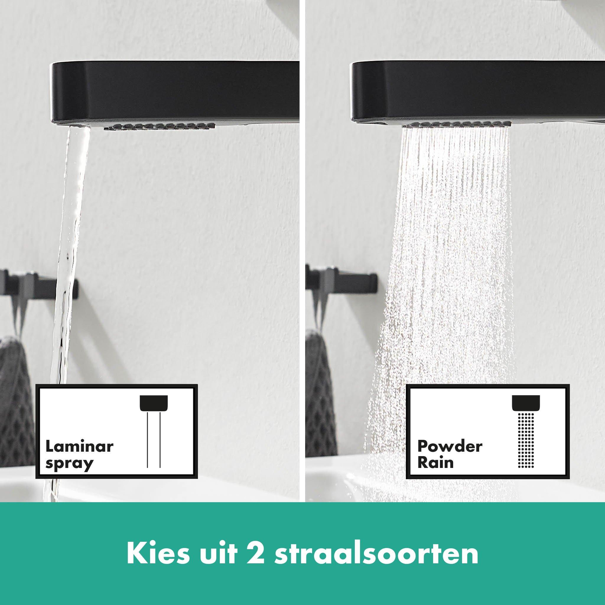 Le design minimaliste et géométrique en mat noir donne immédiatement à votre salle de bains une apparence contemporaine. La finition mate est non seulement magnifique à voir, mais aussi pratique : les empreintes digitales et les gouttes d'eau sont moins visibles, ce qui permet au mitigeur de rester beau plus longtemps. Cela facilite l'entretien et garantit que votre salle de bains a toujours un aspect soigné. Grâce au design expressif, ce mitigeur devient un véritable point focal qui confère à votre salle de bains une ambiance luxueuse et moderne.