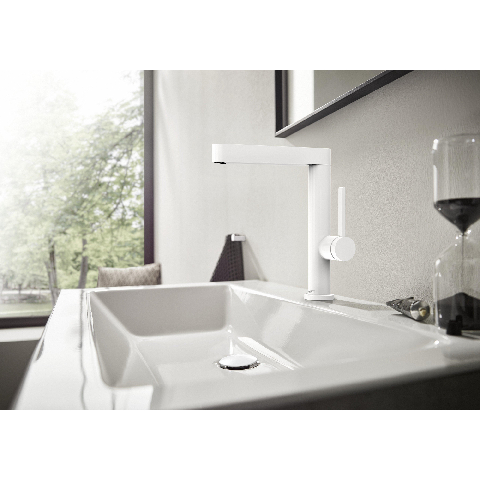 Le bec pivotant pratique à 120 degrés rend l’utilisation du robinet particulièrement flexible. Que vous remplissiez de grands seaux ou laviez vos cheveux, la haute sortie d’environ 22 cm offre suffisamment d’espace et de confort. Le garniture de vidage PushOpen fournie fonctionne sans tirette d’une simple pression sur le bouchon de vidage, vous ouvrez ou fermez la vidange, ce qui assure un aspect épuré et minimaliste sans leviers inutiles. Grâce aux flexibles de raccordement flexibles, l’installation est simple et rapide. Ce robinet convient également aux systèmes de chauffage à circulation continue, ce qui le rend polyvalent pour différentes salles de bains.