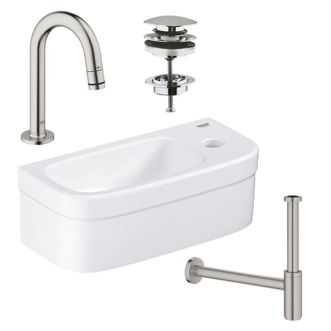 Le GROHE Euro ensemble pour lave-mains 37x18cm 1 trou de robinetterie sans trop-plein robinet courbé super acier siphon bonde lave-mains rectangulaire blanc est une solution complète pour un WC ou une petite salle de bains fonctionnelle. Cet ensemble pour lave-mains combine un petit bassin gain de place avec un robinet courbé assorti, un siphon et une bonde, afin d’harmoniser facilement tous les éléments. Grâce à son design rectangulaire et à sa finition blanche, ce lavabo mural s’intègre aussi bien dans une salle de bains moderne que dans un intérieur plus intemporel. Avec ce lave-mains compact et sa robinetterie coordonnée, vous créez un espace de lavage soigné et pratique, sans compromis sur le design ni sur le confort d’utilisation.