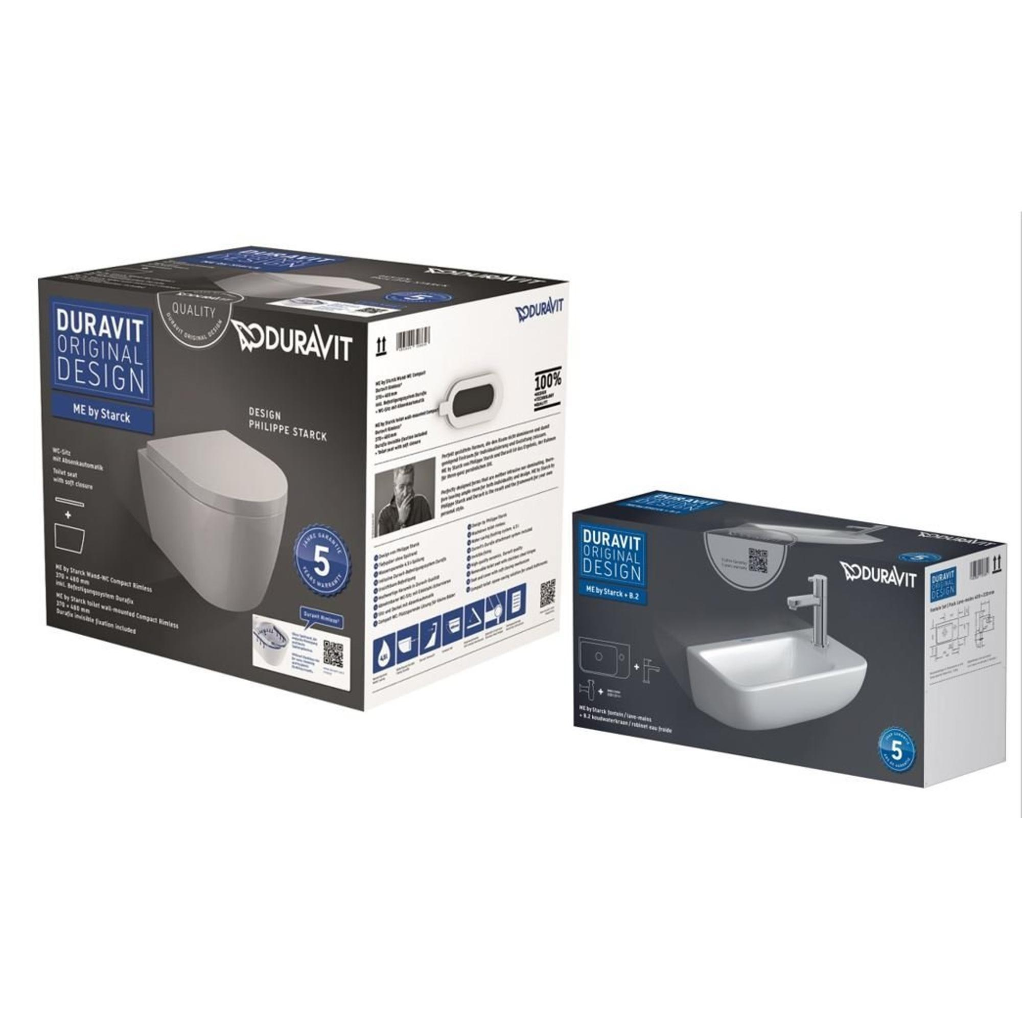Duravit Me by starck Set WC suspendu compact abattant softclose blanc brillant et ensemble lave-mains blanc 40x22cm robinet de lave-mains et siphon chrome inclus