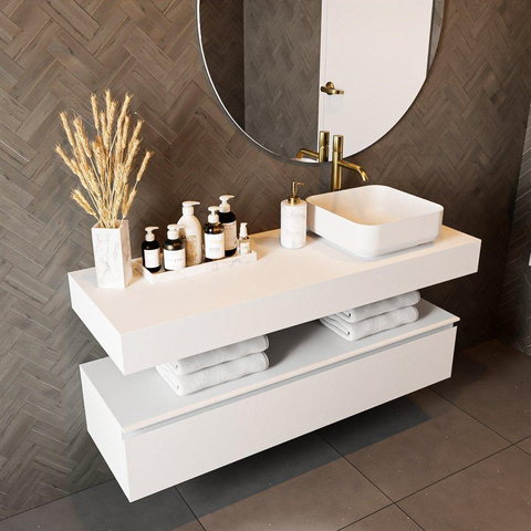 MONDIAZ TOP 46 Talc module suspendue / tablette en solid surface 130cm Bord 12cm de haut. Plateau adapté pour vasque