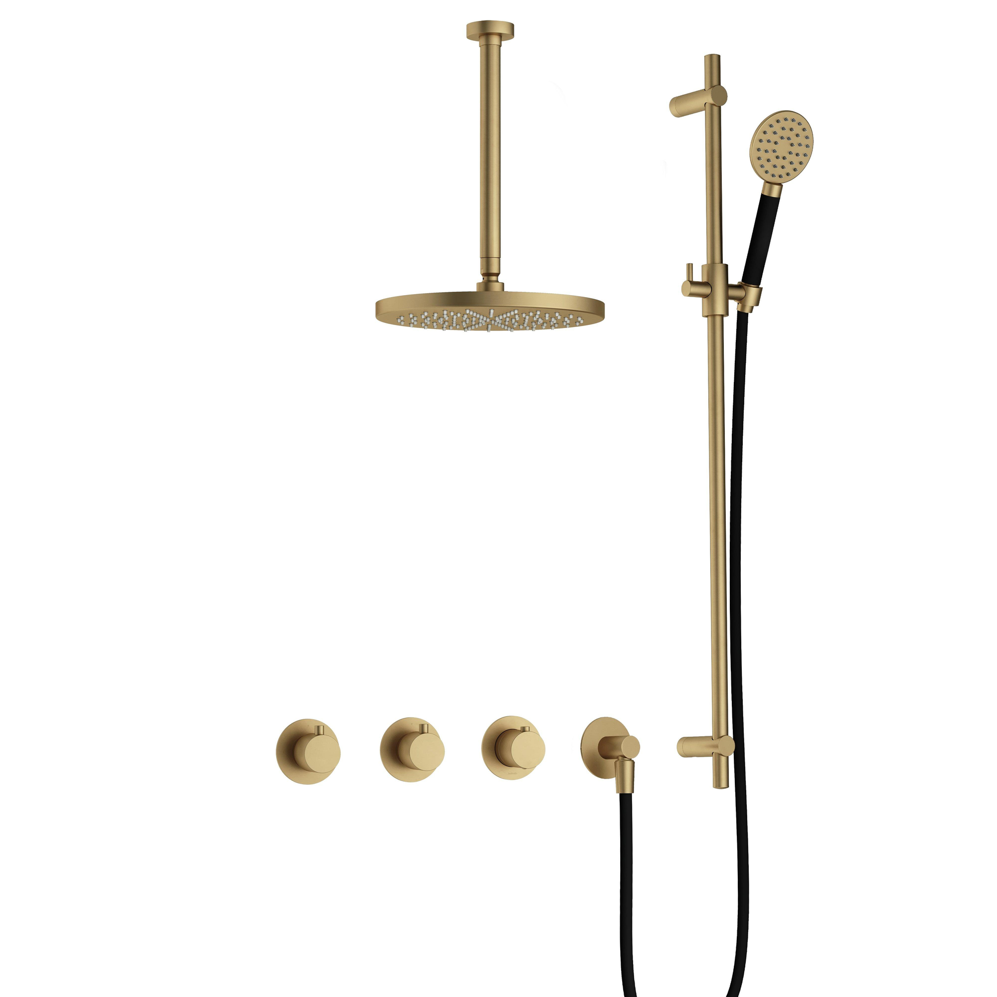 Hotbath Cobber ensemble de douche thermostatique avec 2 stop valves avec douchette ronde tuyau plafond 30cm et barre coulissante laiton brossé
