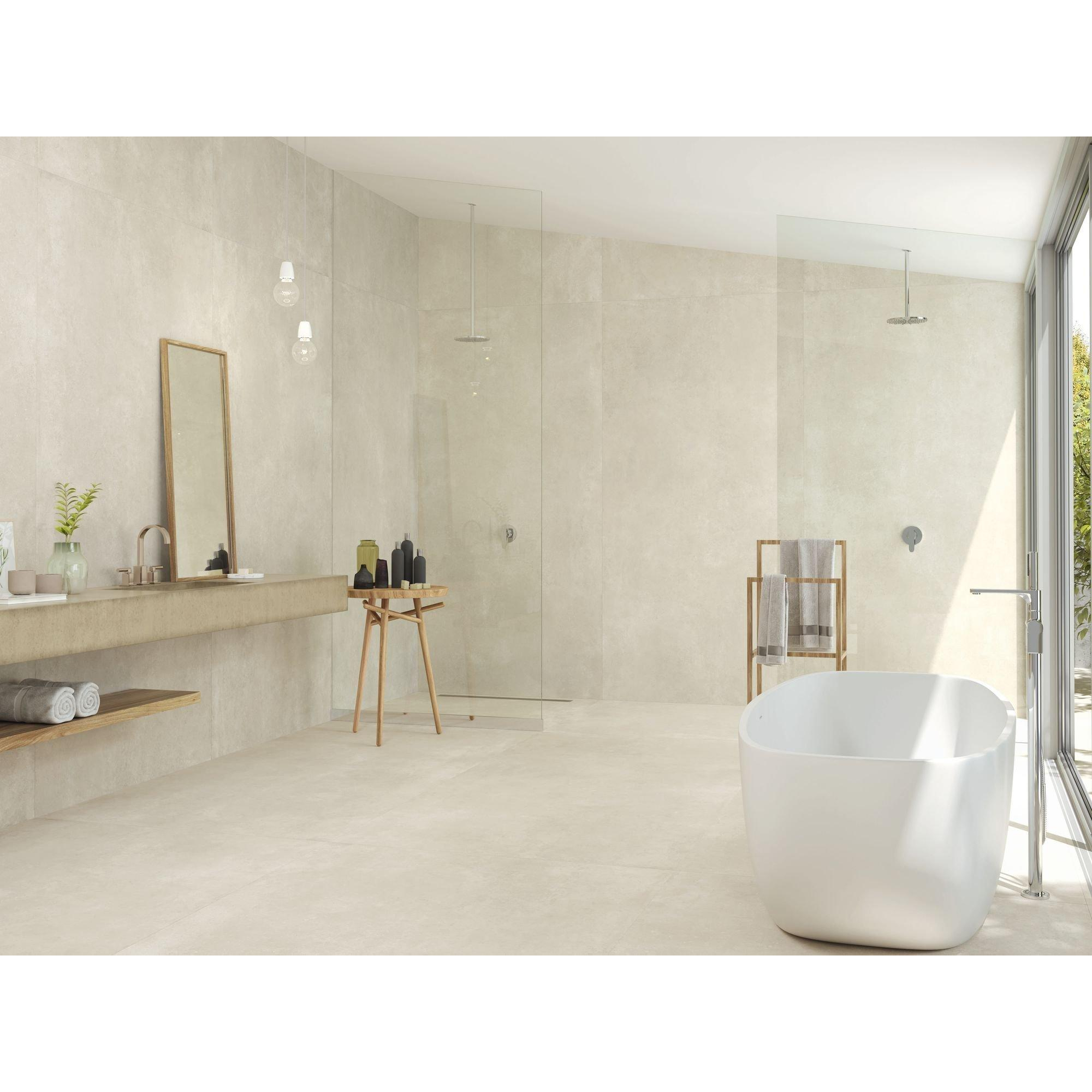 Le carrelage mural Baldocer Ceramica Arkety peut être décrit comme magnifique. La combinaison de la forme rectangulaire, de l'effet béton et de la couleur subtile Arkety bone crée un carreau visuellement attrayant qui transforme immédiatement l'espace. La surface mate offre une sensation de luxe et procure une apparence raffinée qui s'intègre parfaitement dans un aménagement moderne.