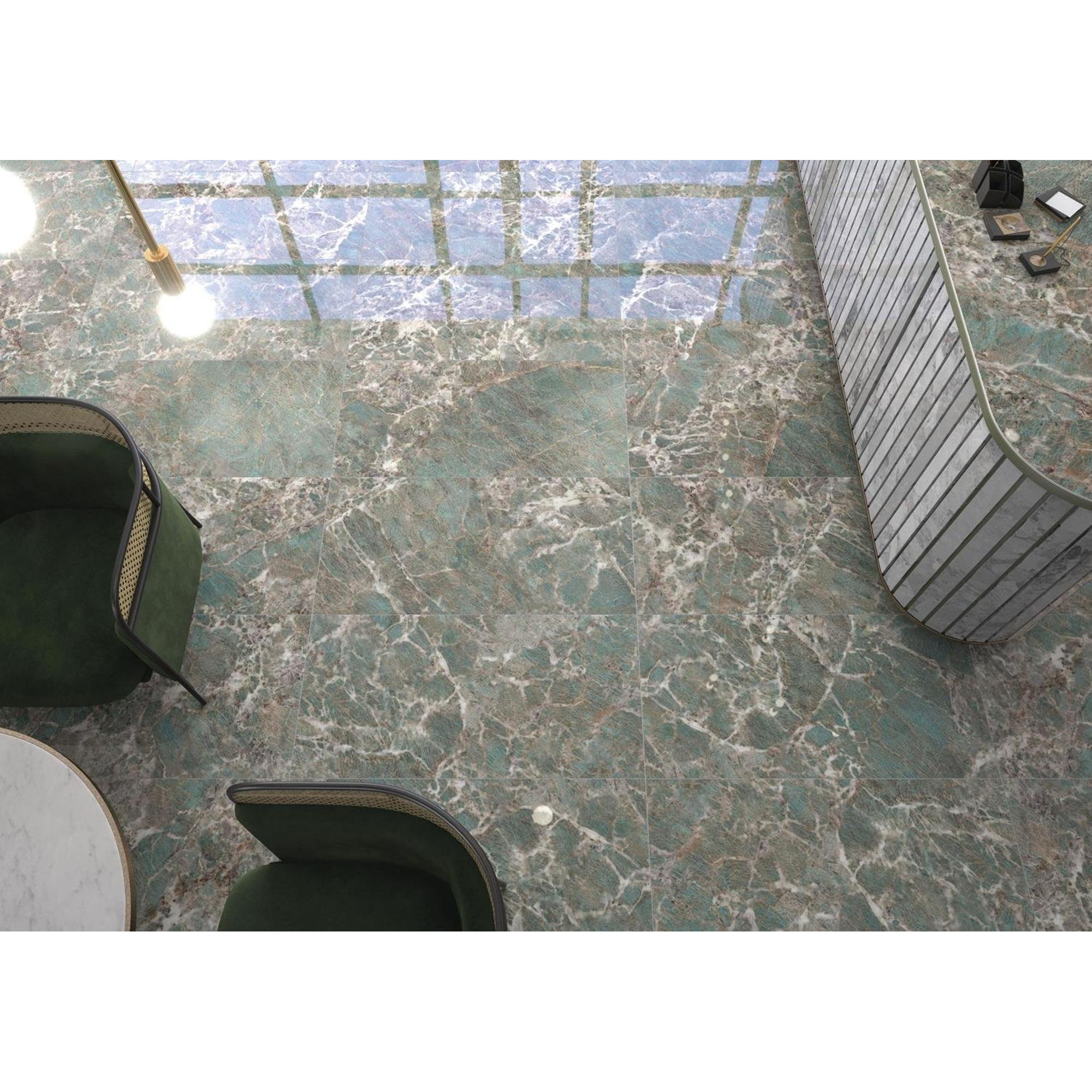 Ce carrelage s’adapte sans effort à différents styles d’intérieur, du classique au moderne et éclectique. La teinte verte apporte une ambiance fraîche et vive, tandis que l’imitation marbre ajoute une touche de luxe. Que vous souhaitiez habiller entièrement un mur ou recherchiez un sol avec du caractère, ce carrelage offre de multiples possibilités. Grâce aux bords rectifiés, vous le posez de manière extrêmement précise, ce qui crée une apparence calme et cohérente. Vous créez ainsi un espace qui correspond parfaitement à vos goûts et à vos envies, avec un carrelage qui convainc tant sur le plan fonctionnel qu’esthétique.