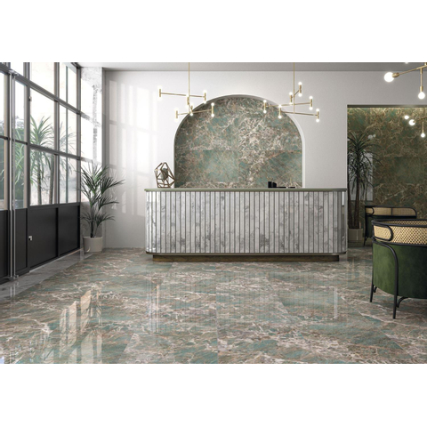 L’apparence de ce carrelage est véritablement à couper le souffle. La surface polie reflète subtilement la lumière et renforce ainsi l’imitation marbre verte qui ajoute une élégance naturelle et intemporelle. Cette combinaison donne à votre espace une atmosphère chaleureuse et accueillante avec une touche d’exclusivité. Grâce aux grandes dimensions et à la forme rectangulaire épurée, il en résulte un sol ou un mur sans joints apparents qui respire le calme et l’harmonie. C’est le choix parfait pour ceux qui souhaitent enrichir leur intérieur avec un carrelage élégant et raffiné qui ne se démode jamais.