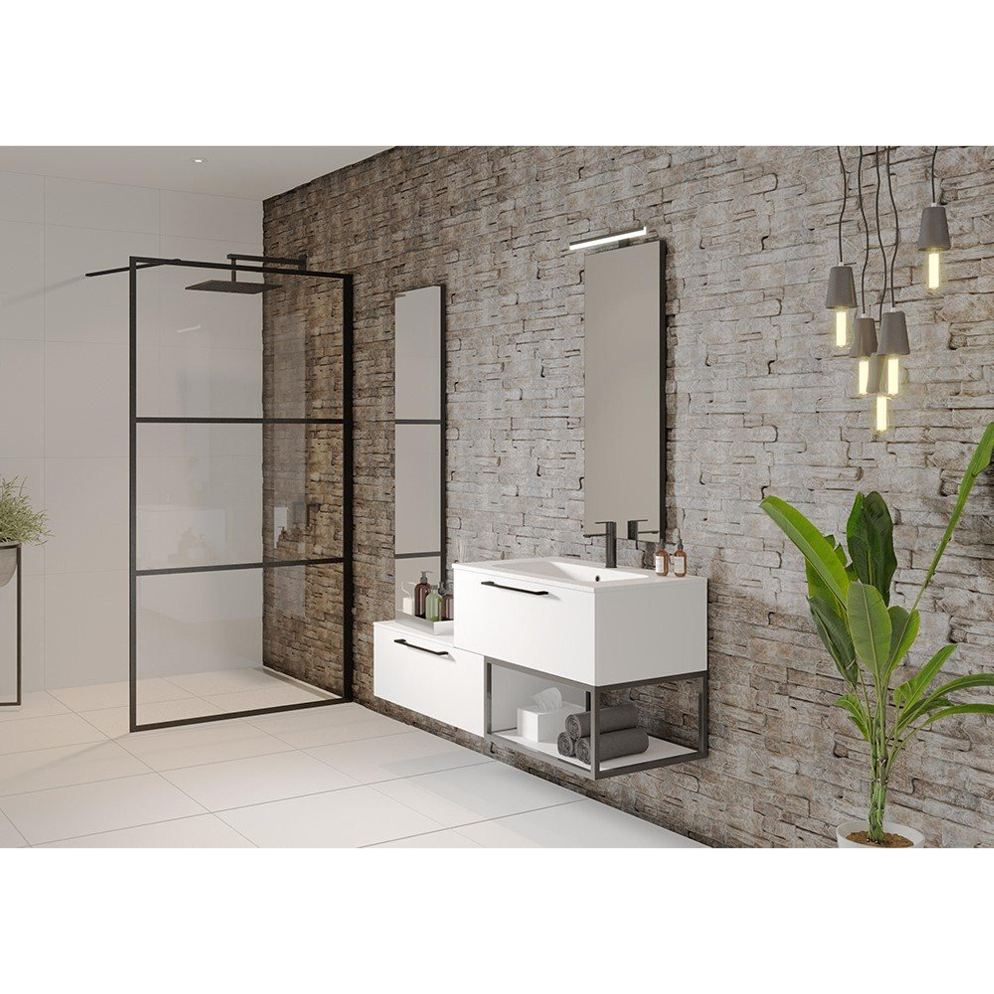 - Design grid marqué avec profilés noir mat pour un style de salle de bains moderne et industriel.