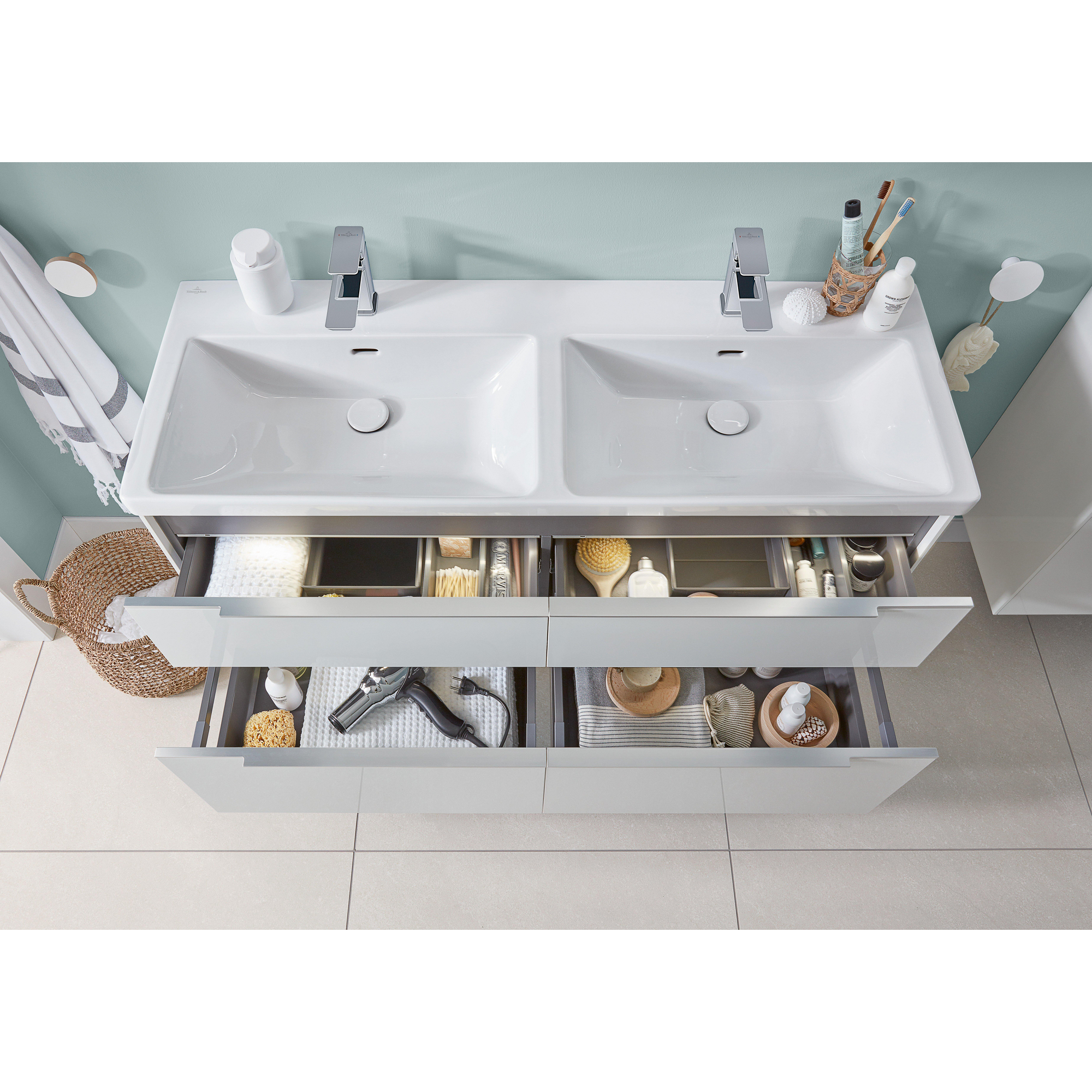 Avec une largeur de 130 cm et deux vasques à part entière, ce lavabo double offre amplement d’espace pour effectuer vos routines du matin et du soir simultanément. La cuve profonde et fonctionnelle évite les éclaboussures d’eau gênantes sur les meubles de salle de bains et le sol, ce qui fait vraiment la différence dans une situation familiale ou une salle de bains partagée. Grâce aux deux trous de robinet, vous pouvez installer deux robinets, de sorte que chacun dispose de son propre espace pour se brosser les dents, se raser ou se maquiller. Le large rebord de robinetterie offre un espace de pose supplémentaire pour les distributeurs de savon, gobelets et produits de soin, ce qui réduit le besoin d’étagères ou de paniers séparés. Ainsi, le lavabo reste ordonné et visuellement apaisant, même lorsqu’il est utilisé de manière intensive.