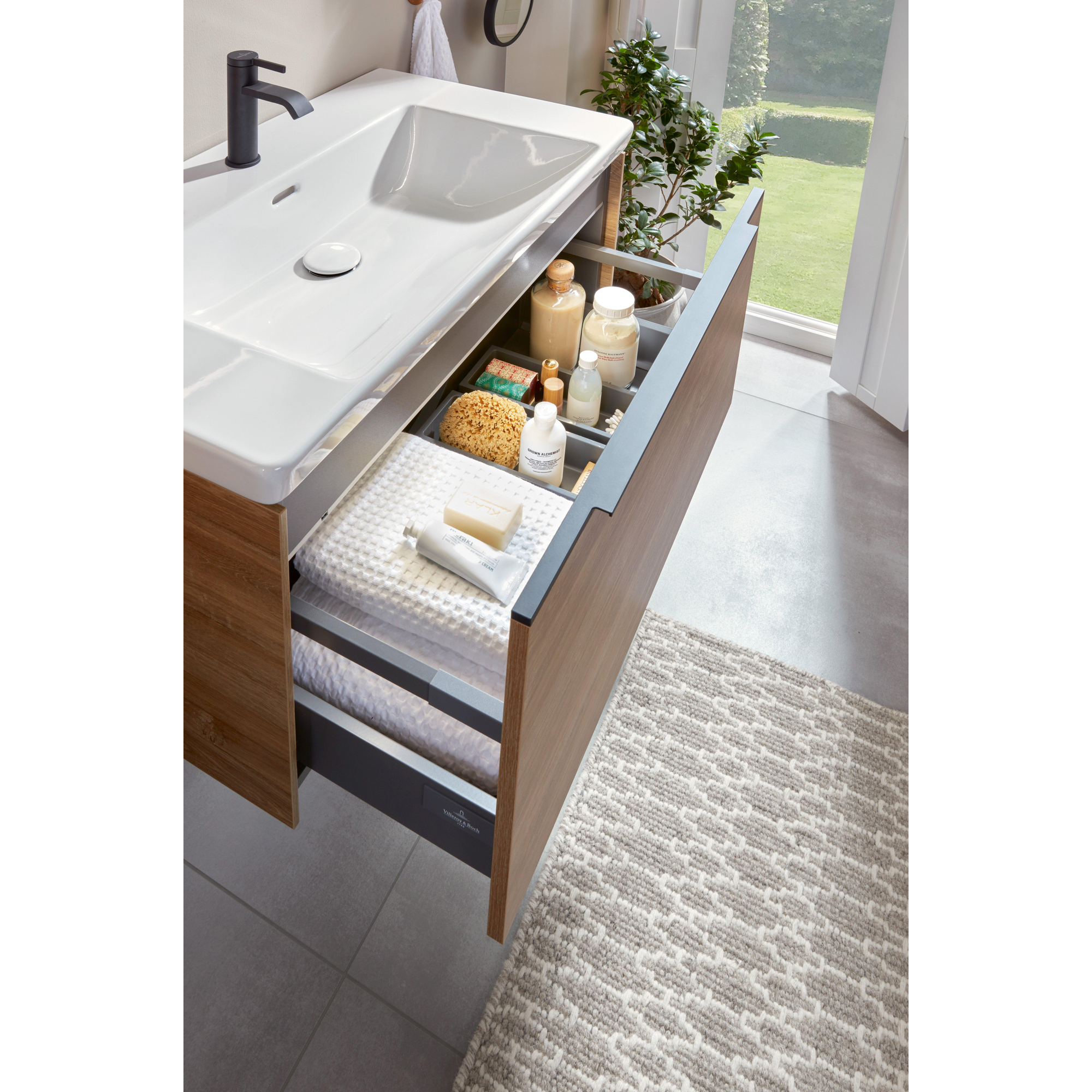 La cuve profonde et fonctionnelle est conçue en pensant à votre routine quotidienne. Comme la cuve est particulièrement profonde, vous avez moins de problèmes d’éclaboussures et même le lavage des cheveux ou un petit lavage à la main devient confortable et pratique. La large plage de robinetterie et les deux surfaces généreuses sur les côtés vous offrent tout l’espace nécessaire pour les distributeurs de savon, les gobelets à brosses à dents et autres essentiels, sans donner une impression de désordre. L’orifice de trop-plein allongé est discrètement intégré, mais apporte une vraie tranquillité d’esprit : même si le robinet reste ouvert par inadvertance, l’excédent d’eau est évacué proprement. Vous combinez ainsi confort au quotidien et aménagement de salle de bains réfléchi et bien ordonné.