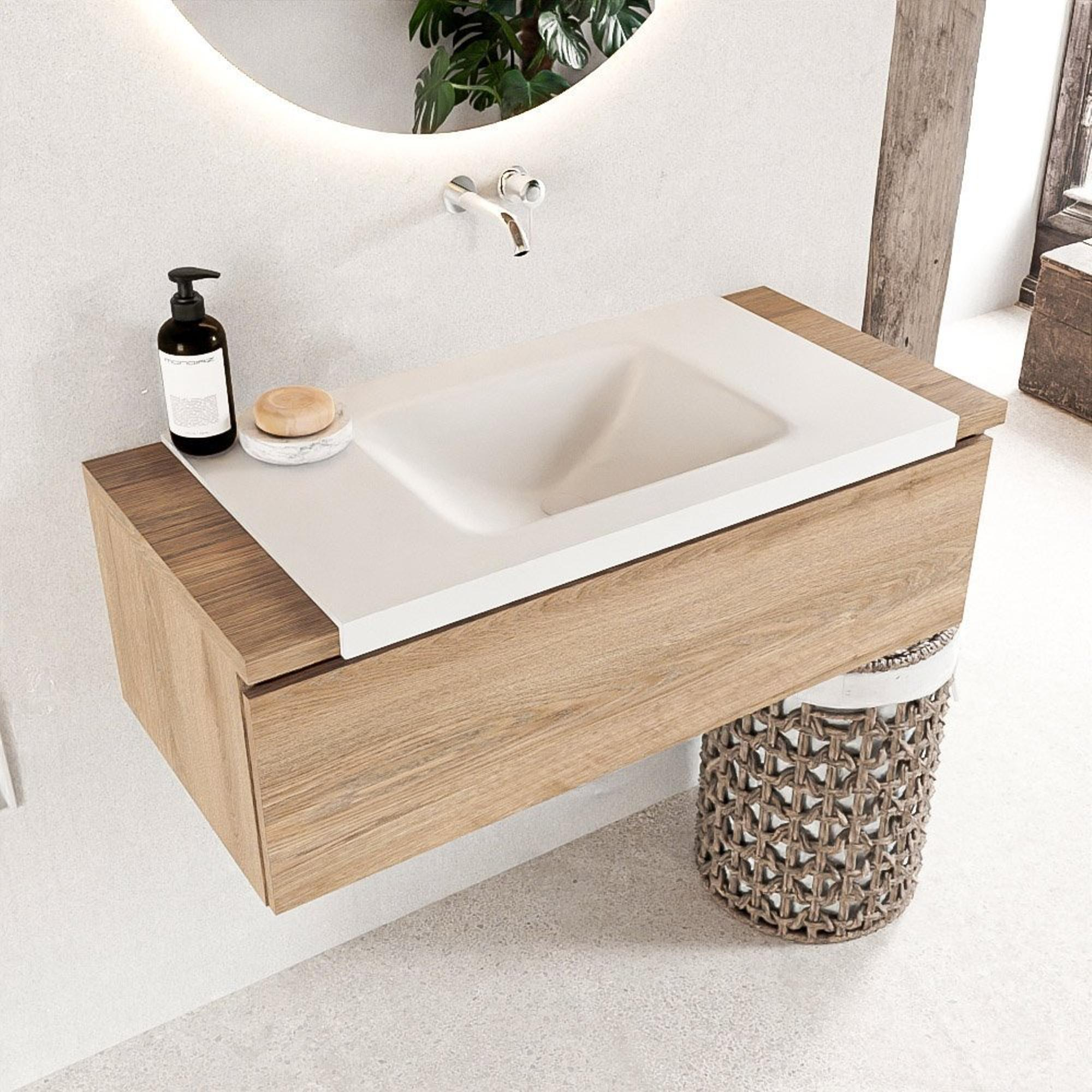 Mondiaz BUKLA Ensemble de meuble - 100x45x34cm - 0 trou de robinet - lavabo au centre - solid surface - Talc - sans poignée - 1 tiroir - Mélamine - Chêne blanchi