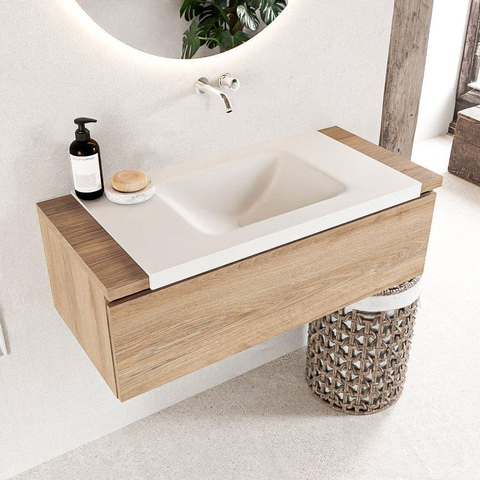 Mondiaz BUKLA Ensemble de meuble - 100x45x34cm - 0 trous de robinet - lavabo centré - solid surface - Talc - sans poignée - 1 tiroir - Mélamine - Chêne blanchi