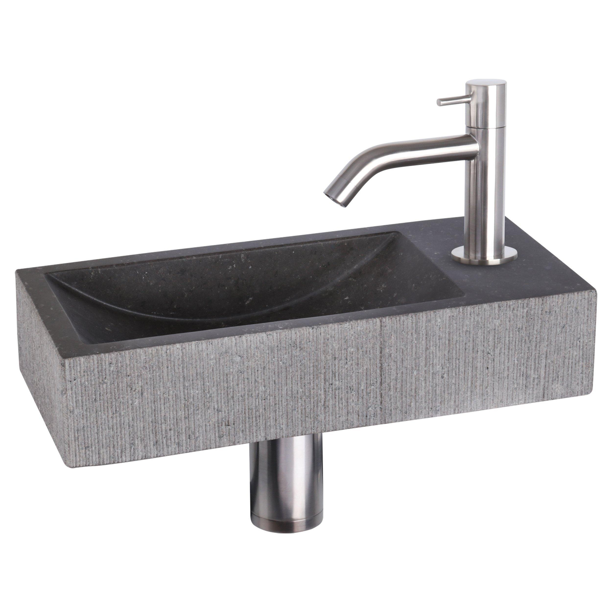 Differnz Ribble kit lave-mains - 38x18x8cm - Rectangulaire - 1 trou de robinet - robinet courbé en chrome mat - pierre naturelle noire